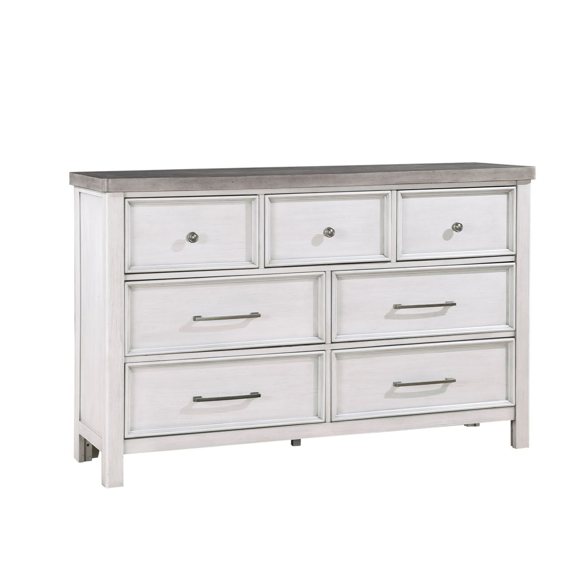 Hints of rustic styling permeate the transitional design of the Ambrose Collection, each subtle accent building to create a classic look for your bedroom. Antique White and Antique Gray finishes highlight the acacia veneer, their hues providing perfect complement to each other. The bar and knob hardware that fronts the drawers of the dresser are finished in antique pewter.