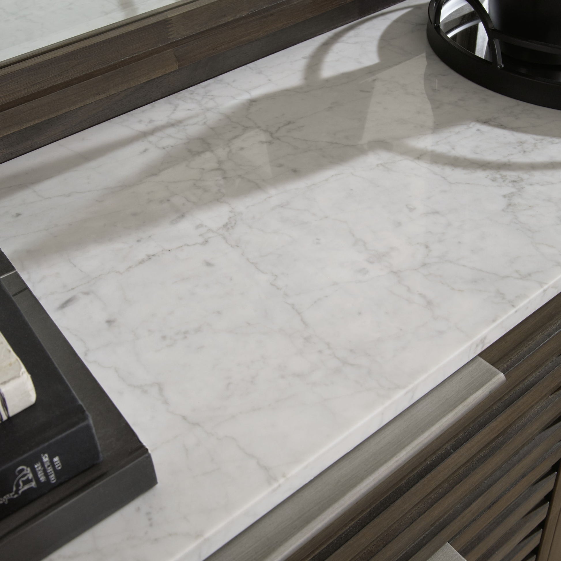 Clean lines lend sophistication and structure to this dresser with mirror. Its complex rich finish contrasts perfectly with a white marble top, while the streamlined silhouette features overlay slats to create visual interest. A metal base and bar pulls in a low-sheen steel finish add to this piece's contemporary vibe.