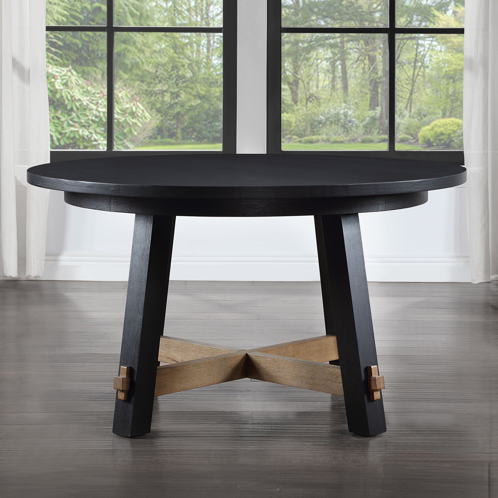 The 54-inch round Aubrey dining table is the embodiment of modern lodge design.. Crafted with acacia veneers, hardwood solids and a blend of craftsman influences and primitive styling, this table exudes timeless elegance.