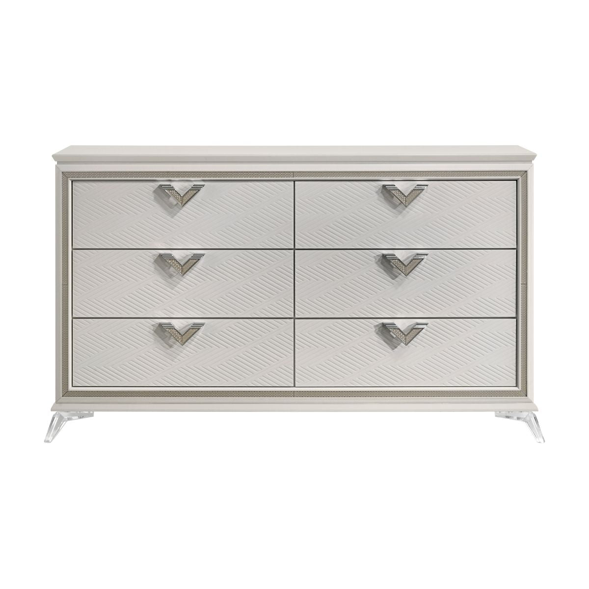 Elevate your bedroom storage with this stunning white and gold 6-drawer dresser, designed to blend functionality with high-end style. Crafted with a durable engineered wood frame, complemented by unique acrylic front legs and sturdy metal rear legs, this dresser offers a perfect blend of stability and contemporary glamour. The six smooth-gliding dovetail drawers, equipped with ball bearing glides, provide ample storage for your clothing and accessories. The top drawers feature felt-lined jewelry trays, offering a luxurious space to organize your precious items. The diagonal grain embossed drawer fronts add a sophisticated texture, while the polished chrome tone triangle pull handles enhance the modern aesthetic. This dresser seamlessly blends functionality with high-end design, making it a perfect addition to any contemporary bedroom. Assembly is required, allowing you to easily incorporate this stylish piece into your space.