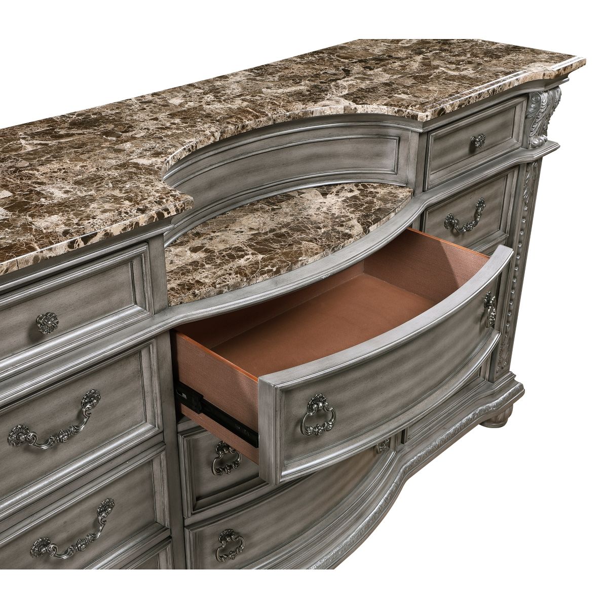 The luxurious grandeur that permeates the design of the Bennington Collection is an amalgamation of classic accenting and traditional lines. Carved bun feet, acanthus leaf carving, bead molding, and elegant framing account for the beautiful profile that defines the dressers design. Antique pewter-finished knob and ring pull hardware fronts the drawers, and marble tops the piece. The gray finish, over acacia veneer, features subtle silver tipping for final luxurious accent.