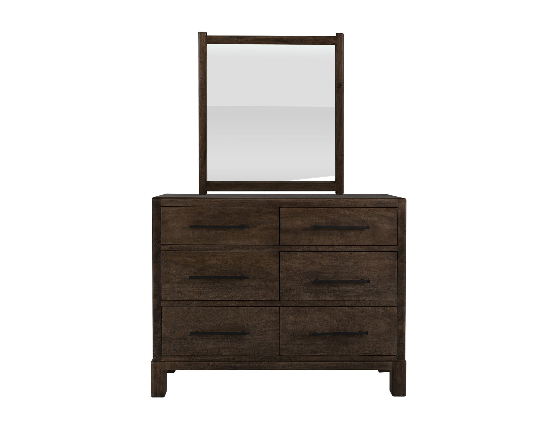 Bedroom Mirror. The Merida Collection features an exquisite bedroom set that perfectly fuses sustainability and design, embodying eclectic modern style. Made from environmentally friendly mango and melina wood, it combines beauty and functionality to enhance your space. The black finish highlights the natural elegance of the wood, creating a serene and inviting atmosphere. The Merida Mirror is designed to perfectly complement the dresser, making it ideal for adding a touch of sophistication to your bedroom décor