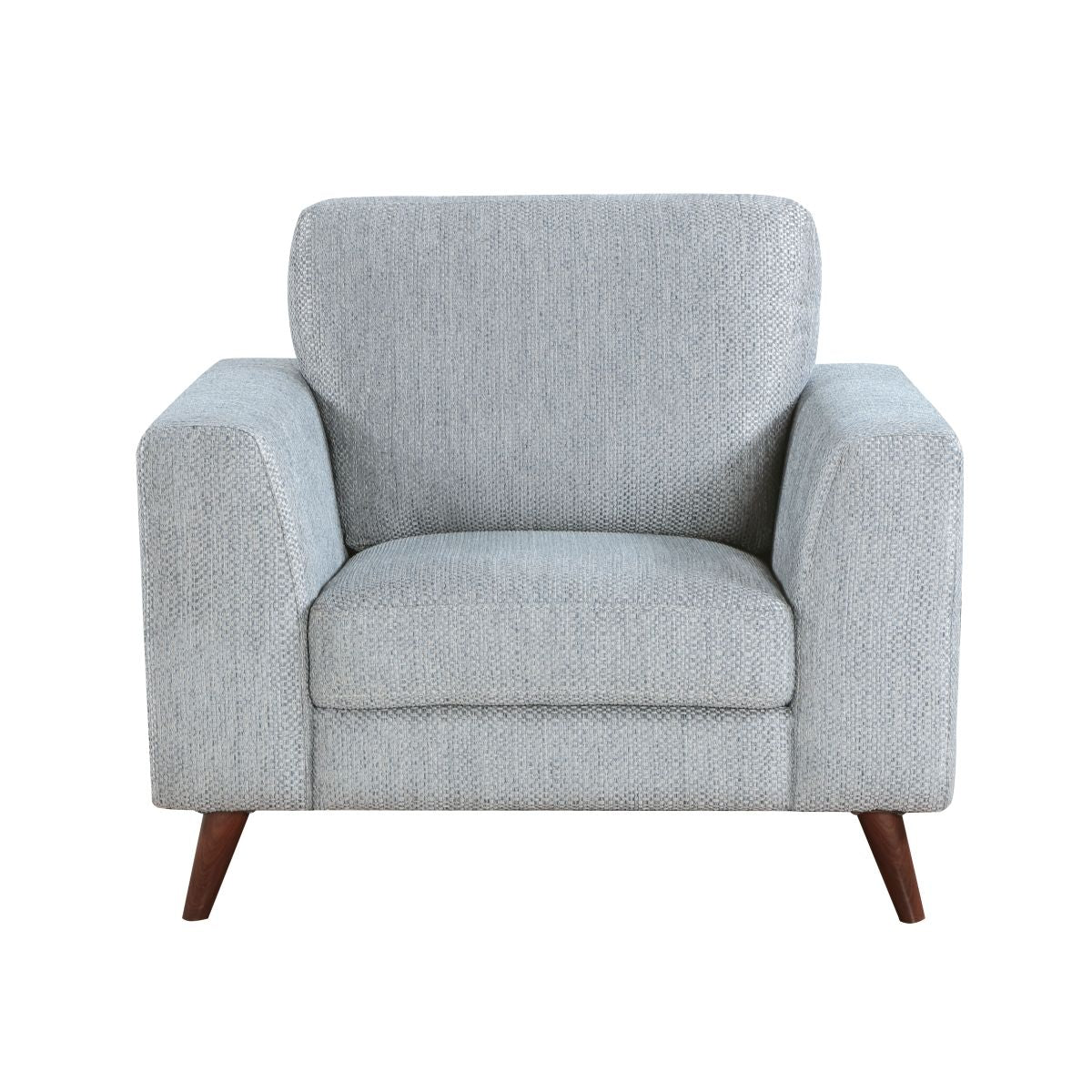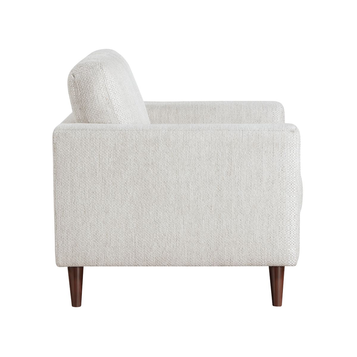 Add a touch of mid-century modern charm and versatile comfort to your living space with this striking side chair. Featuring a reversible back cushion, the soft, textured fabric upholstery complements a variety of dcor styles, while the faux wood brown finish legs provide a warm and stylish foundation. The clean lines and tapered legs embody the timeless aesthetic of mid-century design, making this chair a perfect addition to any room. Enjoy the perfect blend of style, comfort, and functionality with this contemporary side chair.
