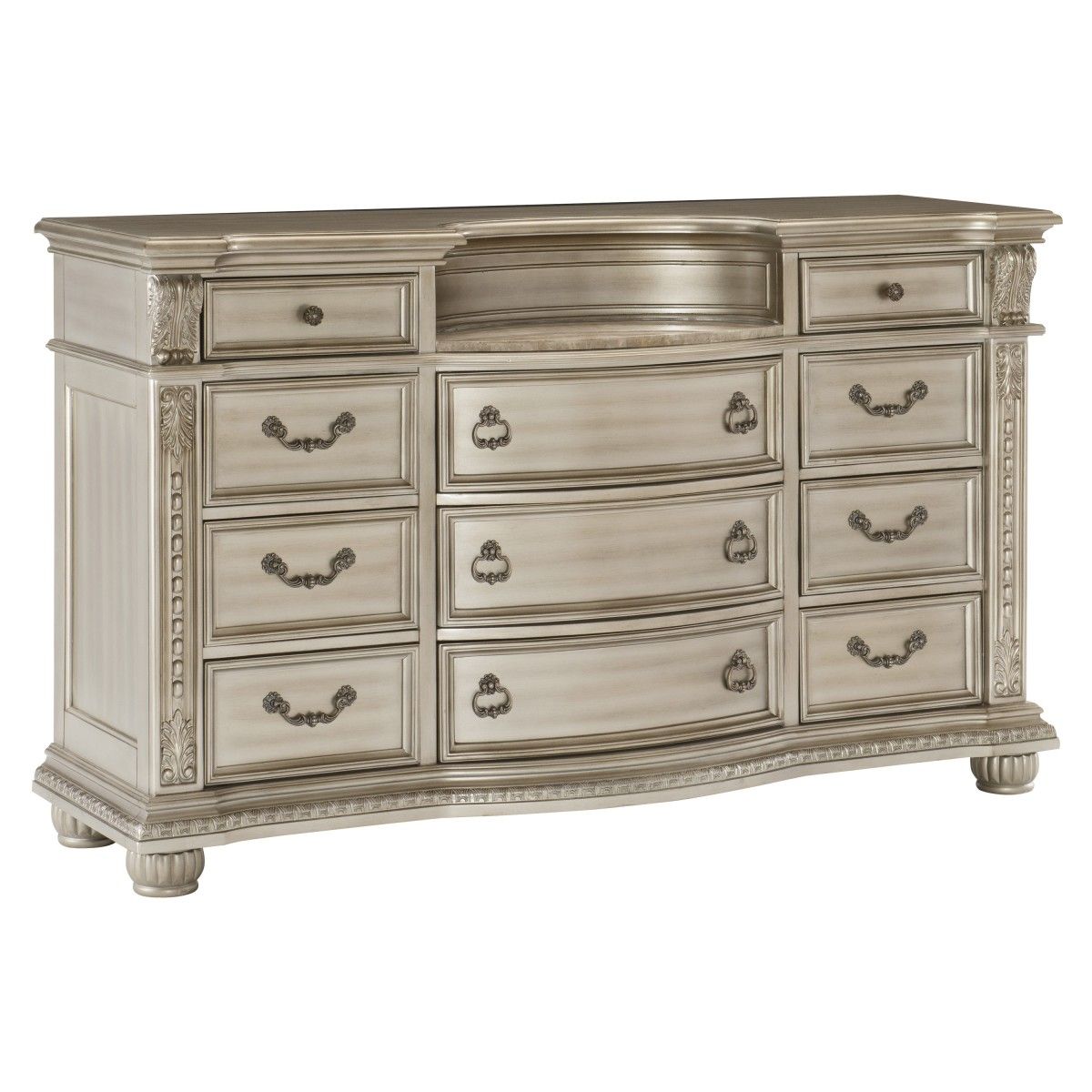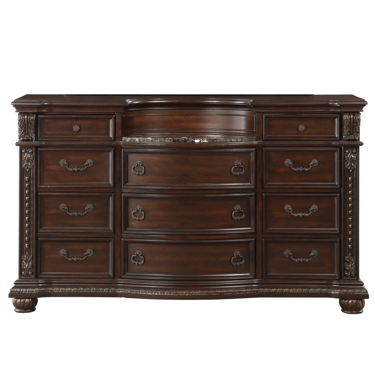 The Cavalier Collection exemplifies the finest in Old World European design inspiration. Egg and dart base moldings, bead molding, acanthus leaf carvings, and genuine marble inset top all blend to achieve an elegant addition for your traditional bedroom. The dressers beautiful details are accented by the finish on birch veneer.