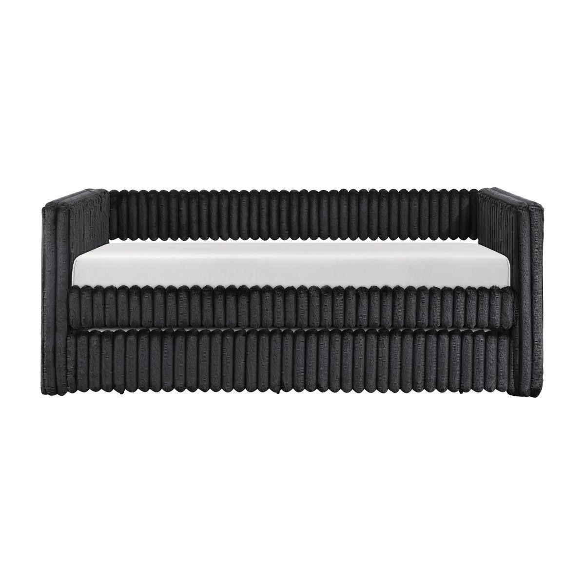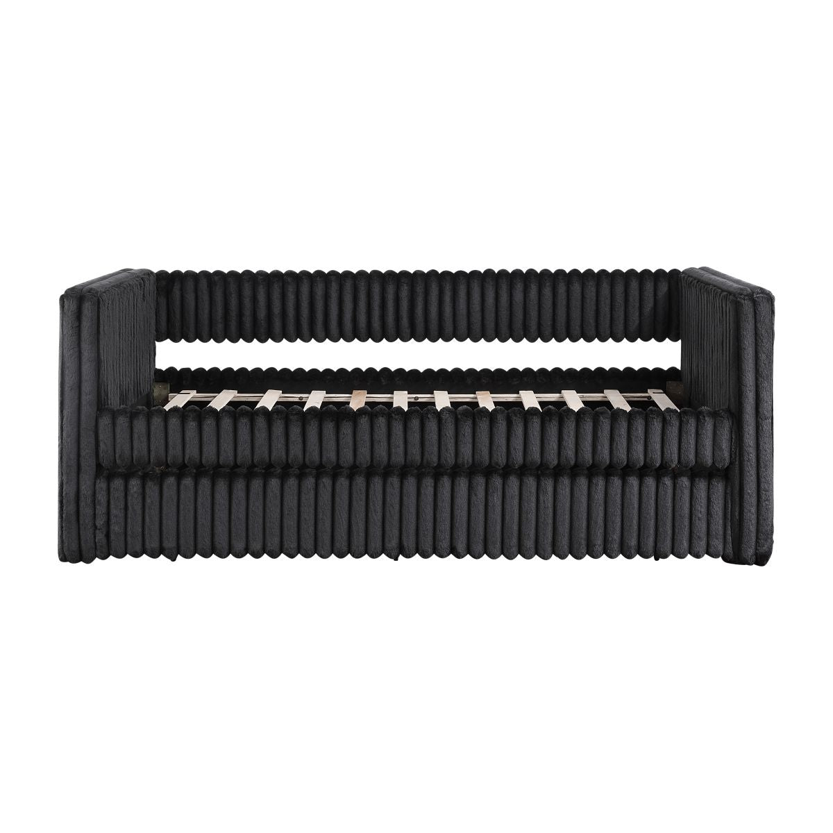 Maximize your guest room or living space with this stylish black corduroy daybed, featuring a convenient pull-out trundle bed for extra sleeping space. Crafted with a sturdy plywood frame and soft corduroy fabric upholstery, this daybed offers both comfort and durability. The trundle bed, equipped with casters for easy movement, provides a seamless sleeping solution for overnight guests. Designed to eliminate the need for a foundation or box spring, this daybed offers a sleek, modern look that complements various dcor styles. Assembly is required.