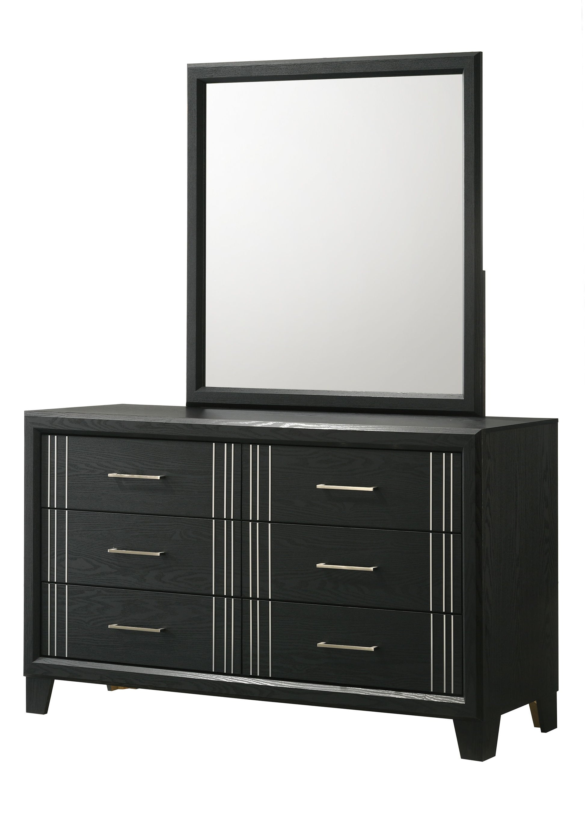 This elegant bedroom collection presents a sophisticated ensemble perfect for creating a refined modern aesthetic in your sleeping quarters. The suite features a sleek, minimalist design with crisp, clean lines and a richfinish that exudes contemporary charm. Anchoring the set is a robust panel bed with a prominent headboard, promising a sturdy and stylish centerpiece. Flanking the bed are complementary case pieces, offering ample storage with their smooth-gliding drawers accented with chic silver-toned hardware.