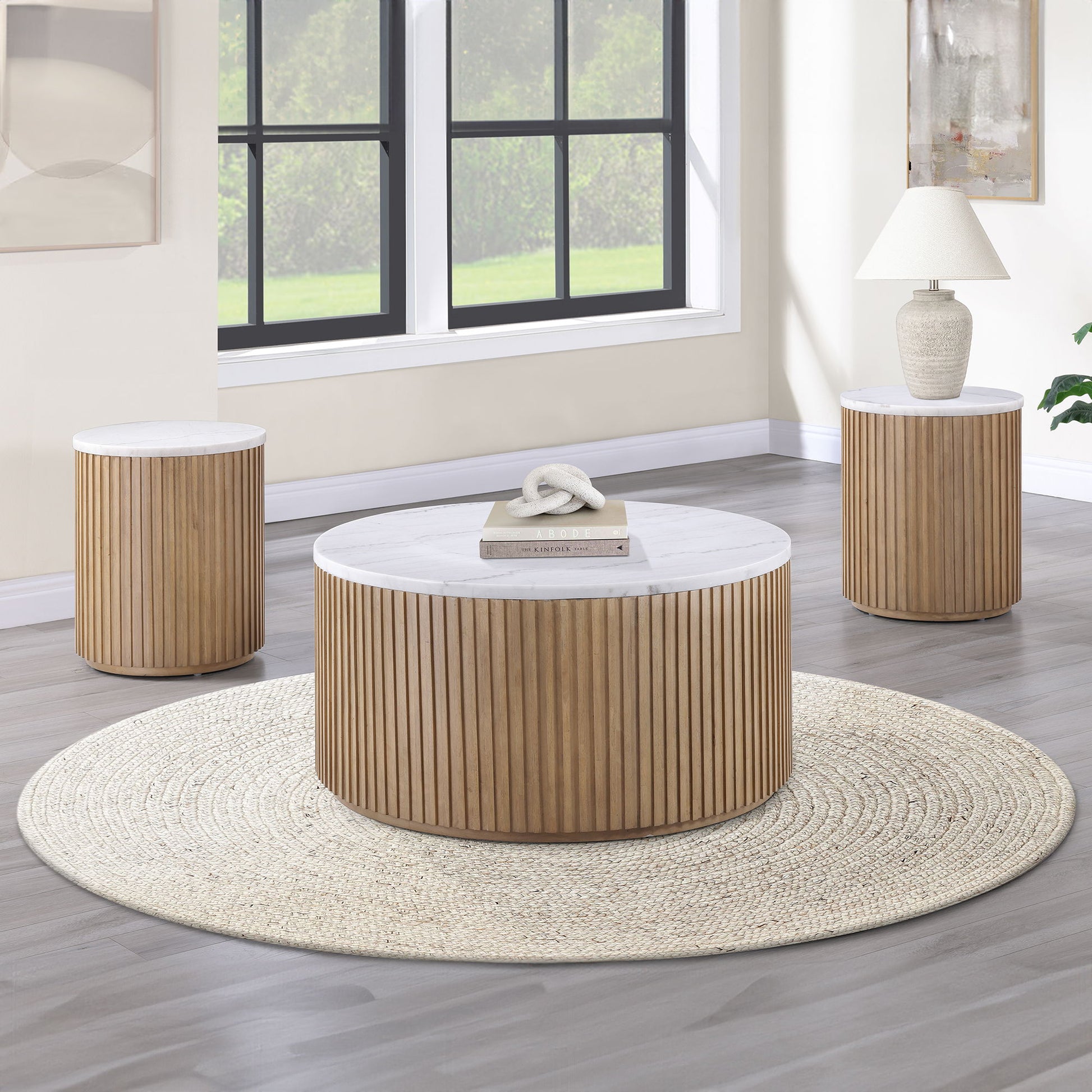 The Colvin 3-Piece Marble Top Table Set, Finish brings timeless elegance with its Art Deco and Empire-inspired styling. The 36″ Round Marble Top Coffee Table features a lustrous marble surface and finished reeded base, combining sleek design with practicality. Equipped with casters for easy mobility, it’s perfect for repositioning or cleaning. Completing the set are two matching Marble Top End Tables, ideal as side companions to chairs or sofas. This set blends luxury, versatility, and sophistication, effortlessly elevating your living space in minutes.