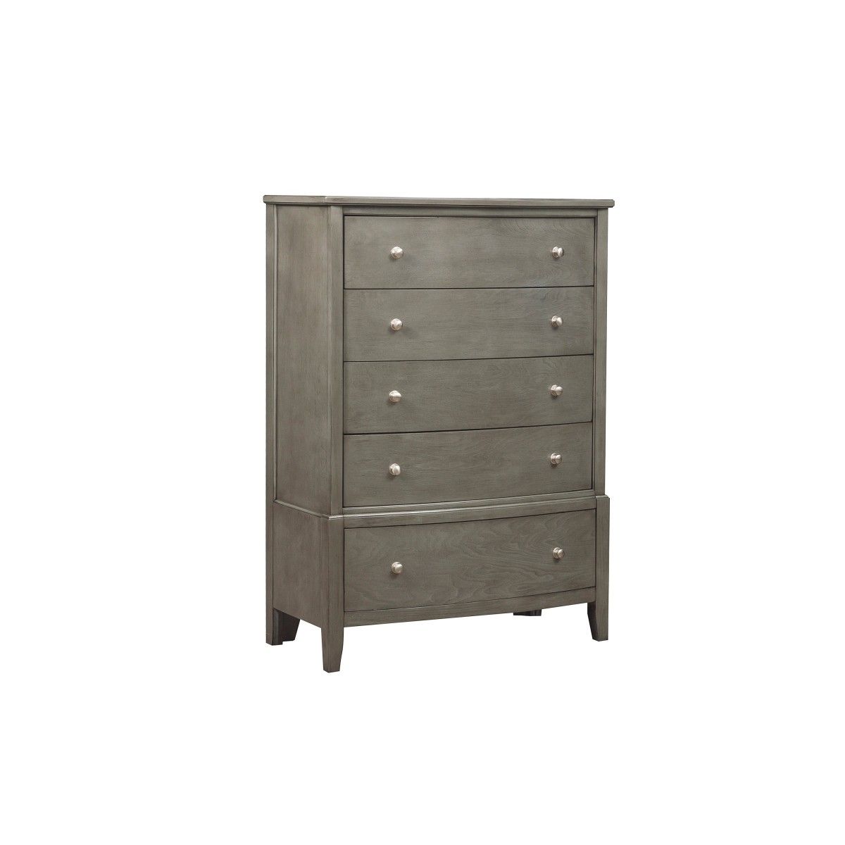 With transitional styling that is at home in a number of decorative environments, the Cotterill Collection will be a versatile addition to your bedroom. The chests cherry finish, over birch veneer, dramatically enhances the woods grain and is perfectly accented by the nickel hardware that punctuates each drawer front.