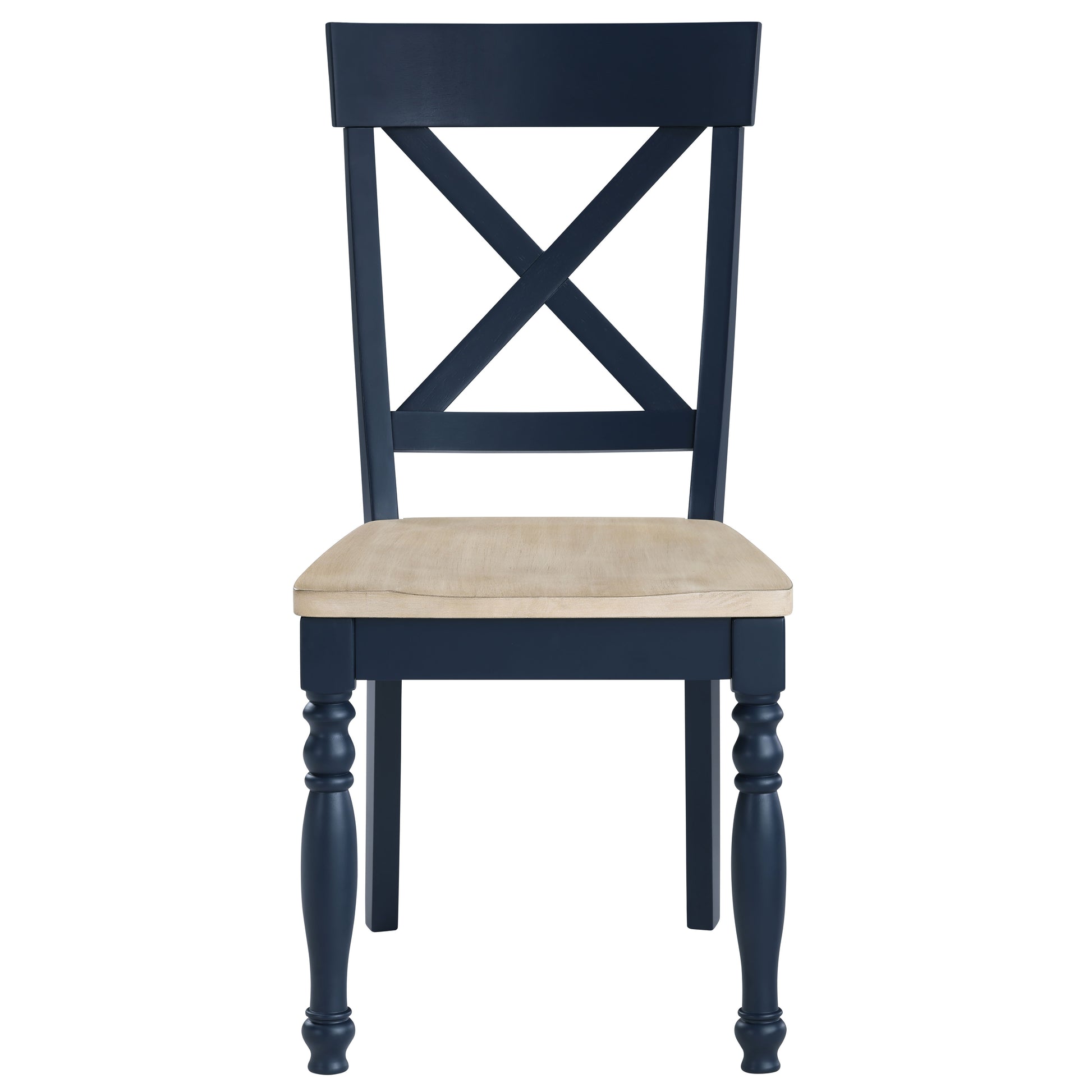 he Darcy Side Chair brings timeless charm with its modified Napoleon X-back design, blending traditional elegance with modern versatility. A two-tone finish pairs deep midnight blue with a natural wood seat, highlighting the wood grain’s warmth. Turned front legs add farmhouse character, while clean lines keep it fresh and contemporary. The contoured seat ensures comfort and durability, perfect for family meals or casual gatherings. Ideal for dining rooms, kitchens, or breakfast nooks, the Darcy Chair effortlessly combines style and function.
