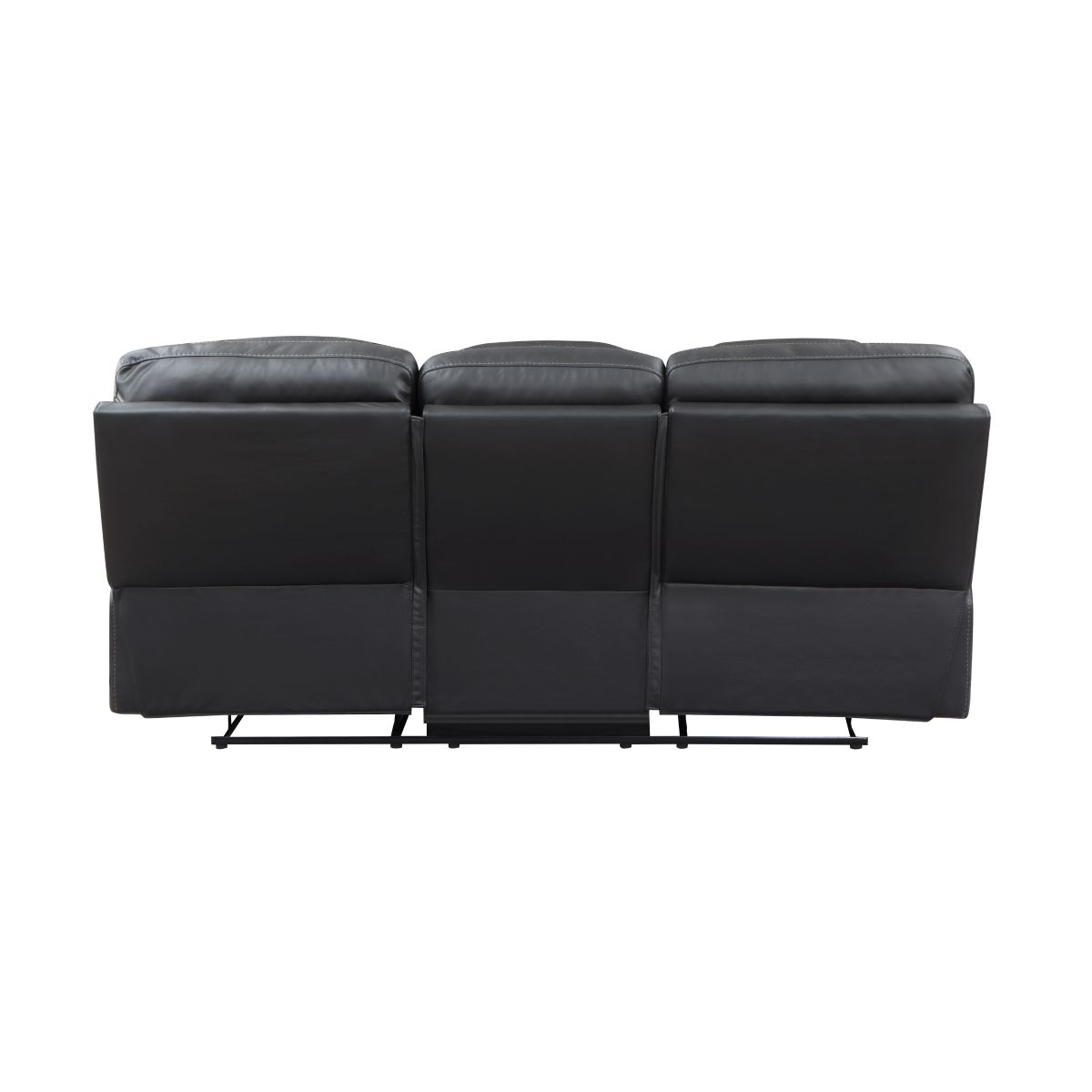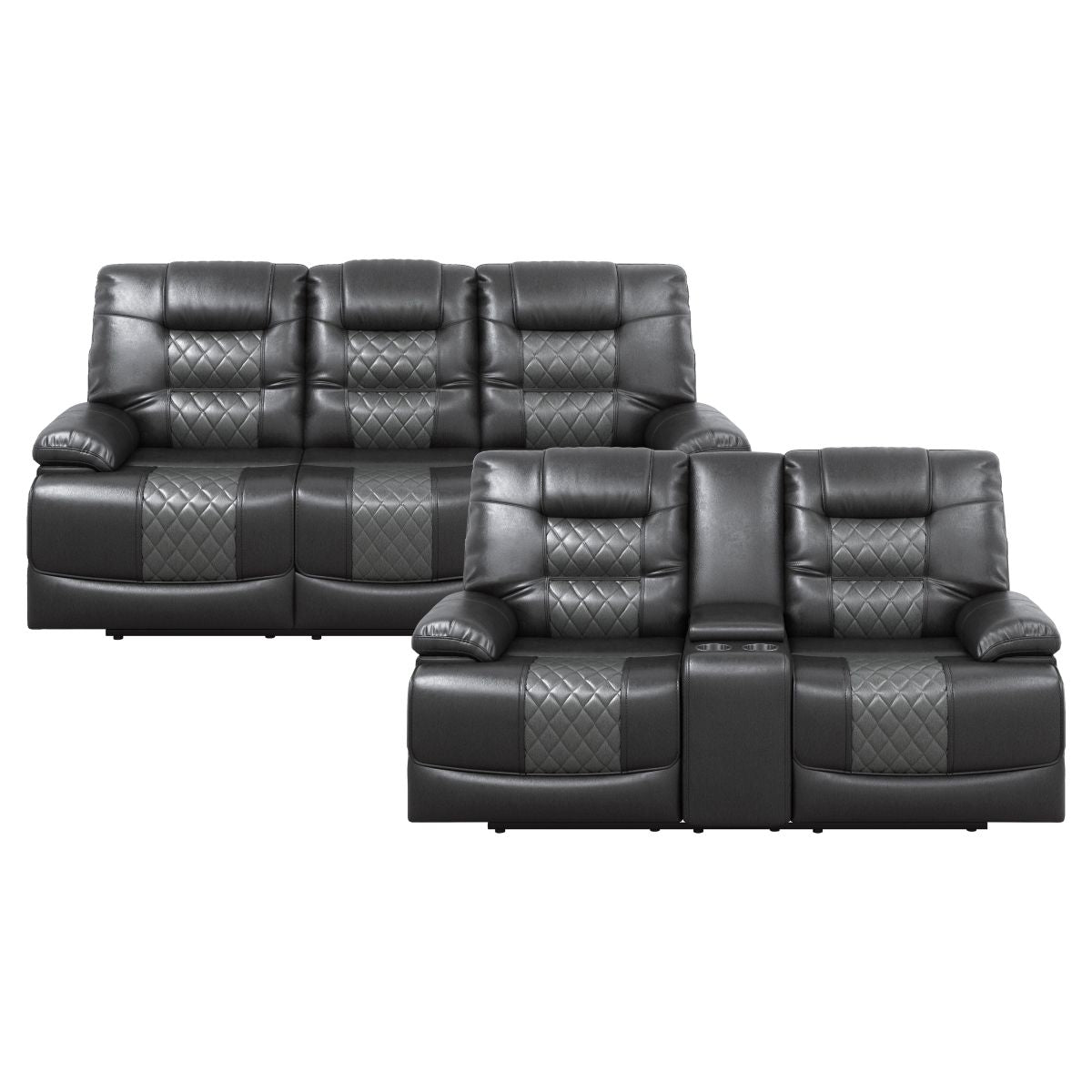 The transitional profile of the Fabian Collection is given a modern edge with the diamond stitching of the seats and electronic conveniences. The sofa, dual glider love seat, and swivel glider chair of the collection feature manual reclining mechanisms allowing for ease of motion when going from seated to reclined. Additional functionality comes in the form of the love seats console, its lift-top hidden compartment featuring USB ports, receptacles, and cupholders providing a convenient spot for beverage and accessory storage, and the sofas drop-down seatback that has cupholders, tabletop, receptacles, and USB ports. Breathable faux leather upholstery is featured in a complementing contrast of two-tone gray for perfect pairing to your homes dcor.
