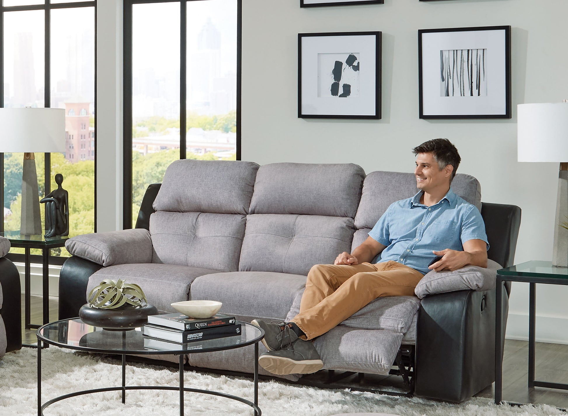Felix a luxurious pub back and decorative two-tone faux leather and fabric treatment. The Reclining Sofa our exclusive Triple Recline feature and convenient Drop Down Table, with companion Rocking Loveseat and Swivel Glider Recliner items.