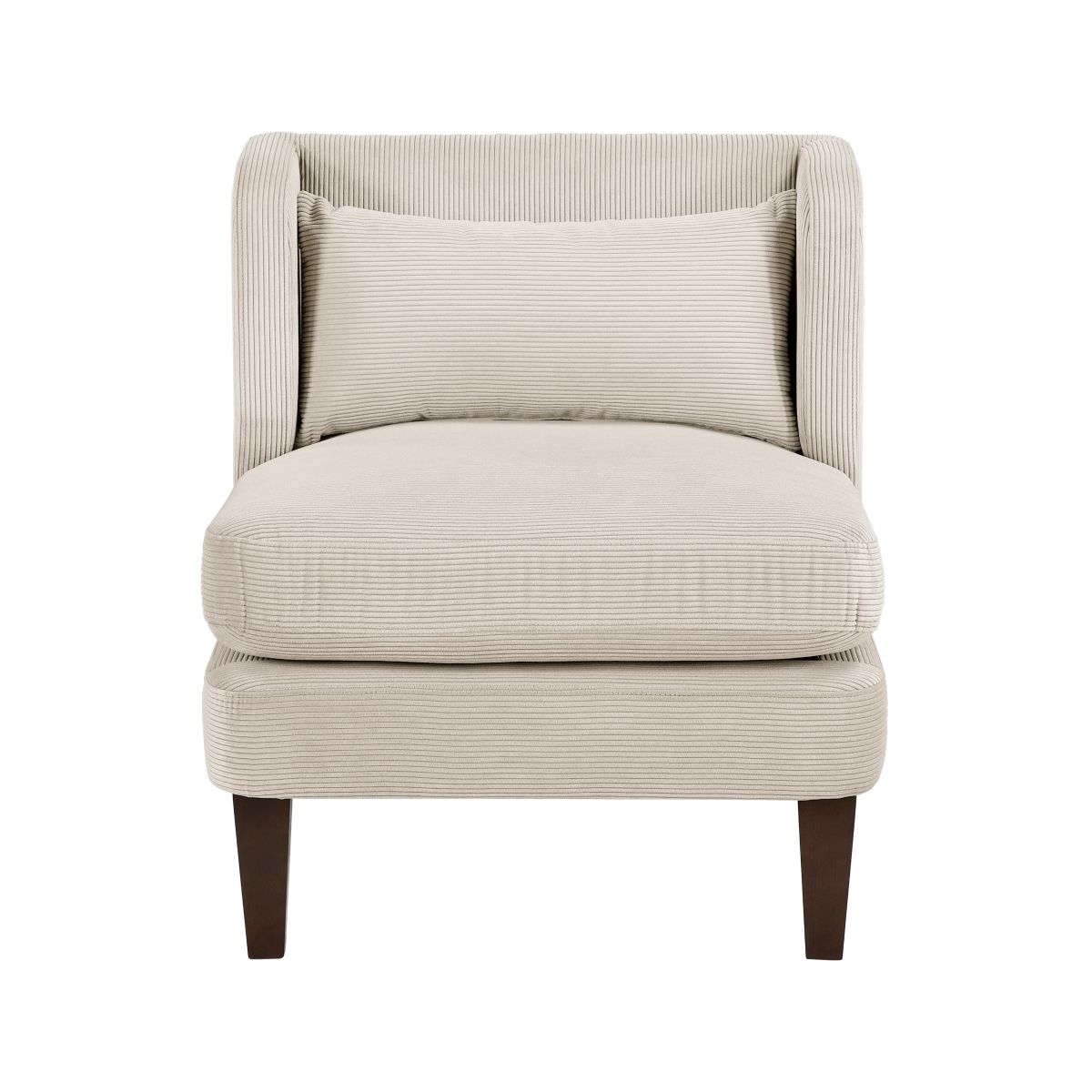Add a touch of contemporary sophistication and comfort to your home with this modern accent chair featuring a unique channeled fabric upholstery. The chair showcases a clean, geometric silhouette with a distinctive wave-like pattern, bringing a fresh and stylish feel to any room. The soft fabric upholstery complements a variety of interior styles, while the generously cushioned seat and included lumbar pillow provide exceptional comfort and support. Sturdy dark wood legs add a touch of contrast and stability, making this chair a perfect addition to your living room, bedroom, reading nook, or office. Enhance your space with this versatile and chic accent piece that seamlessly blends modern design with ultimate relaxation.