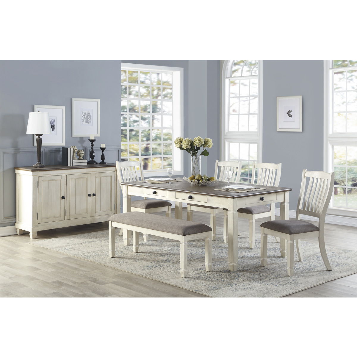 Inspired by the aesthetic of a casual country kitchen, the Granby Collection is an inviting gathering spot for mealtime with family and friends. The wood frame of the dining-height bench is finished in antique and features a neutral tone fabric seat.