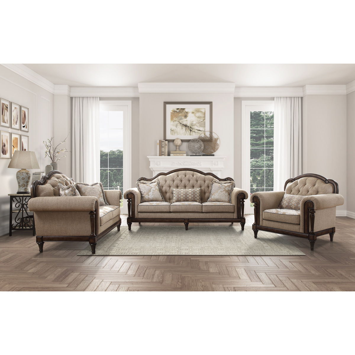 The elegant profile of the Heath Court Collection is comprised of classic elements that have been combined to create the perfect addition to your homes traditional dcor. The neutral hued brown fabric sets the tone for the chairs refined presentation with chenille seat tops, coordinating kidney pillow, button tufting and welting lending complementing accent to the set. The show-wood frame features white oak veneer with a brown finish that complements the fabric cover. The dramatic camelback profile is enhanced by the rolled arms and turned pilaster fronts.