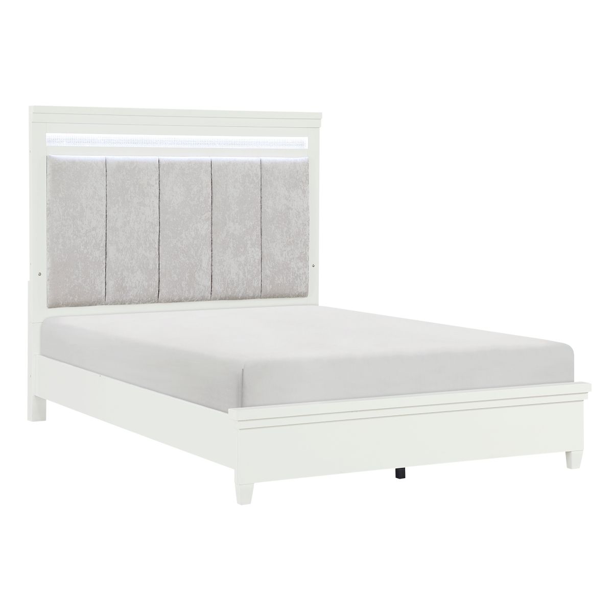 Elegance is beautifully captured in the design of the Kidman Collection. Velvet fabric upholstery covers the panel headboard, with LED backlighting providing dramatic illumination to the collections design. Inset faux crystal banding provides accent to Eastern King bed creating a reflective glow against the white finish.