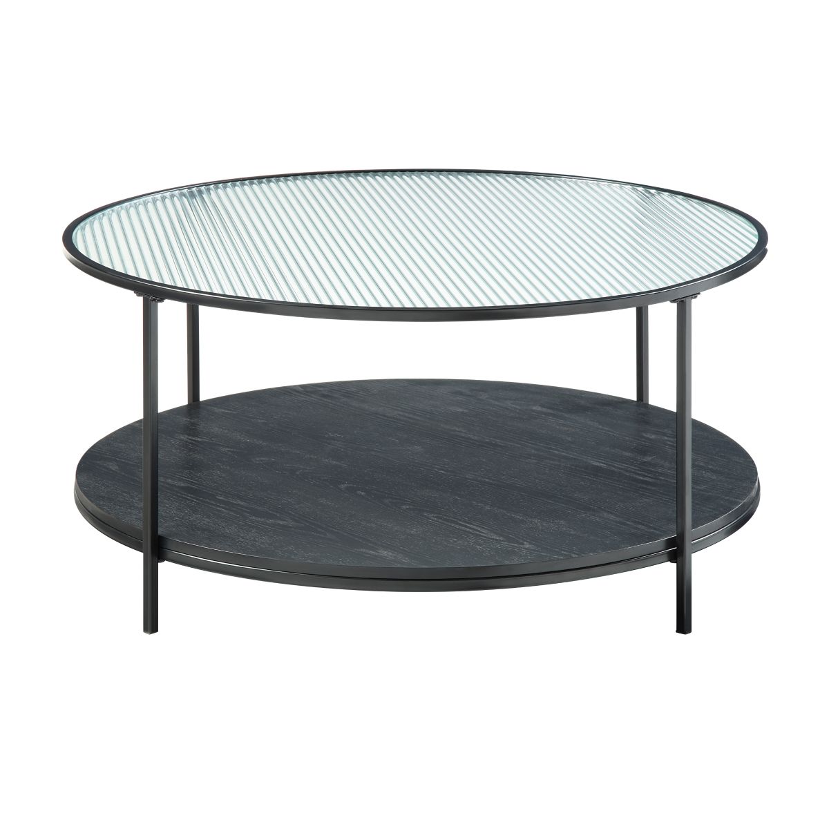Fluted glass tops the tables of the Zephyr Collection, the linear design creating distinct contrast to the round profile of the cocktail table and end table. Black-finished metal comprises the construction of the tables, serving to support the glass top and black-finished wood display shelf.