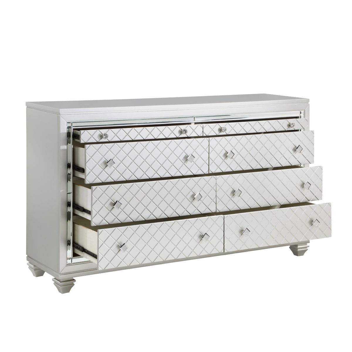 The bold visual presentation of the Leesa Collection complements your glamorous design aspirations. Diamond pattern drawer fronts and hardware, and mirrored framing are featured on the silver-finished dresser, its classic styling lending timeless accent to the look of the collection.