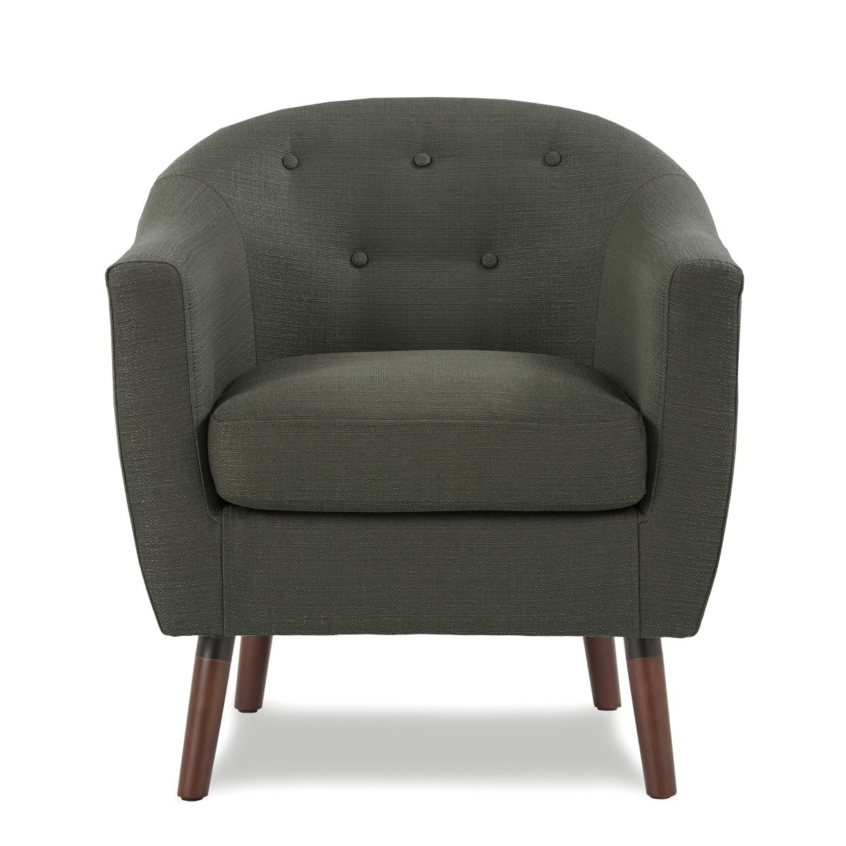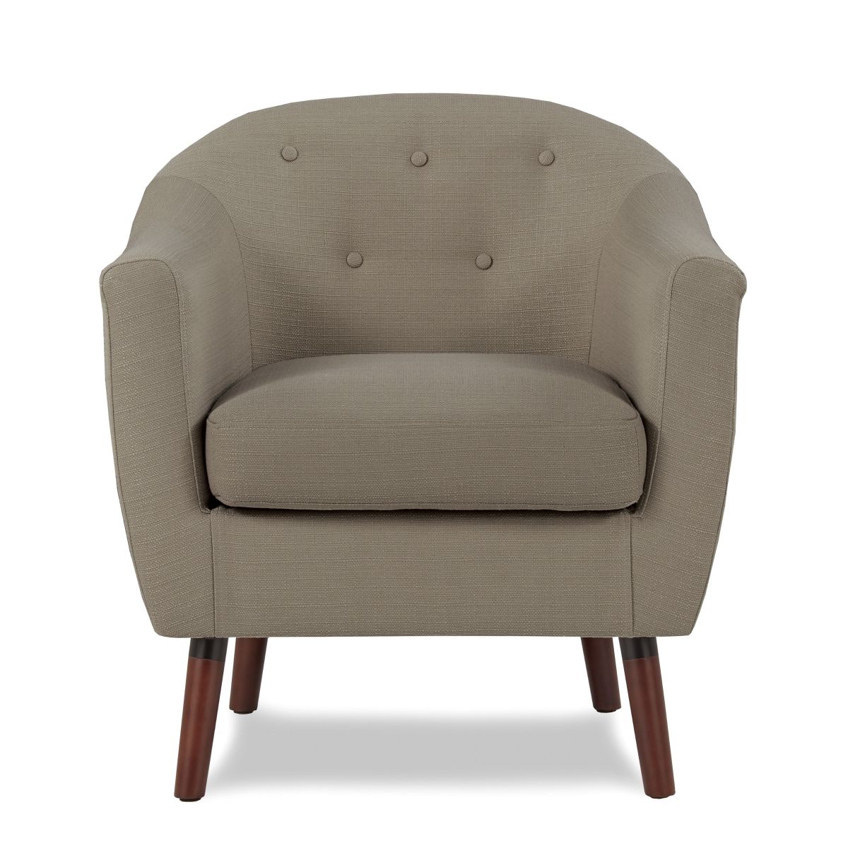 Retro lines need not stay in the past with the mid-century inspired lines of the Lucille Collection. The fabric chair features a contoured chair back with button-tufted accenting and stylishly appointed cherry finished wood legs, providing a look that shows your classic personal style. Additional fabric offerings that range from neutral to bold gray, beige and orange.
