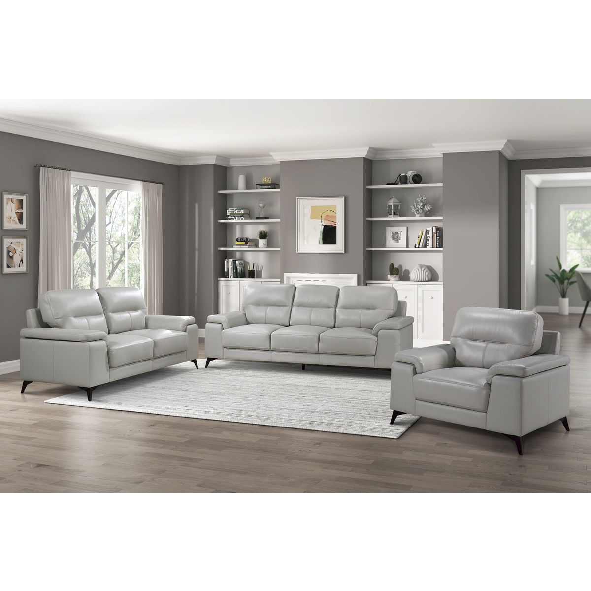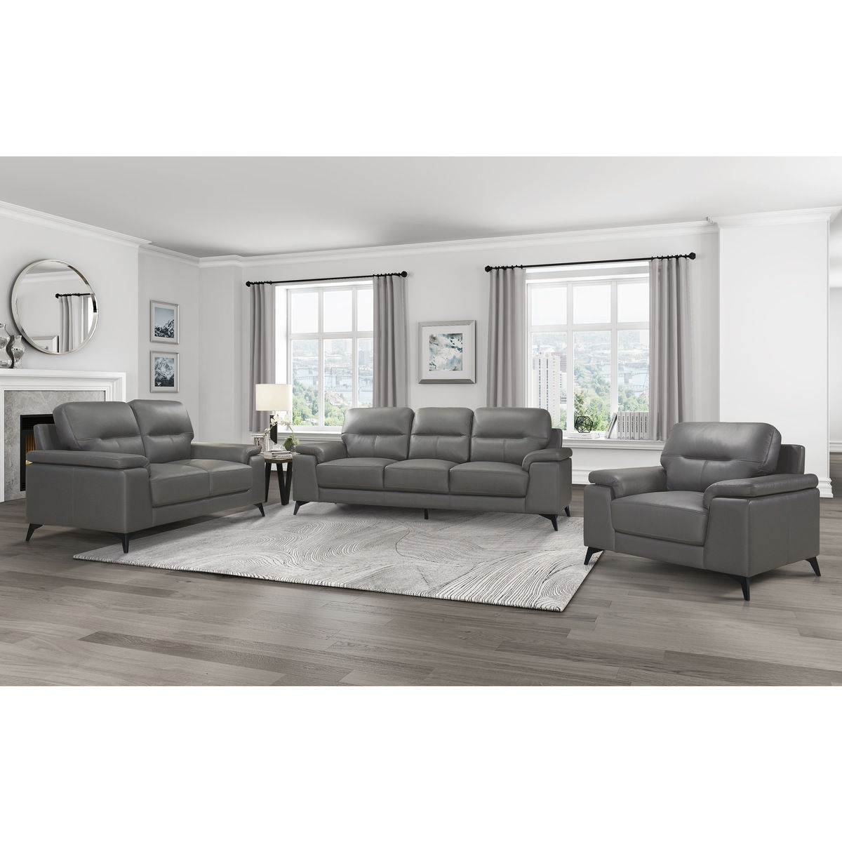 Styled for the modern home, the Mischa Collections chair blends the luxurious feel of leather with the comfort of plush seating. The top grain leather cover, with faux leather, enhances the sleek profile of the collection. Contoured pillow-top arms and black metal legs further enhance the modern stance. Coordinating sofa and love seat are available as well as an optional silver top grain leather cover with faux leather match.