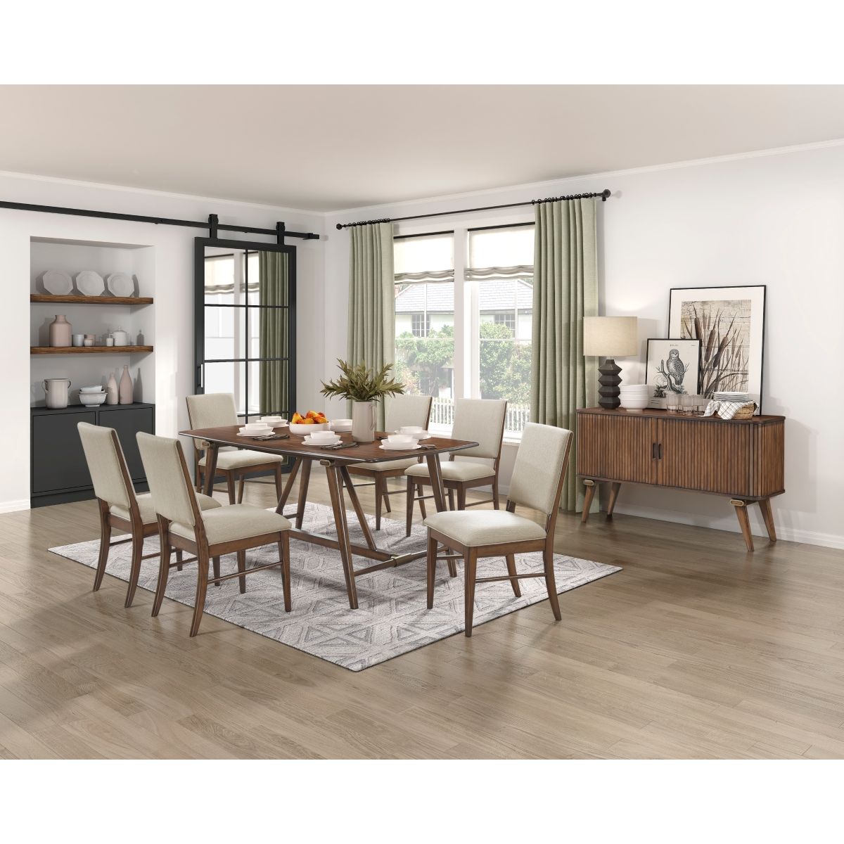With a design that spans transitional, Mid-Century, and modern aesthetics, the Monroe Collection is in a class all by itself. Walnut veneer is accentuated with walnut finish for a classic hue to complement your casual dining room. Tamboured doors encircle the buffet server, their wrap-around design opening to reveal drawers and compartment storage allowing for convenient access to your tabletop dcor and tableware.