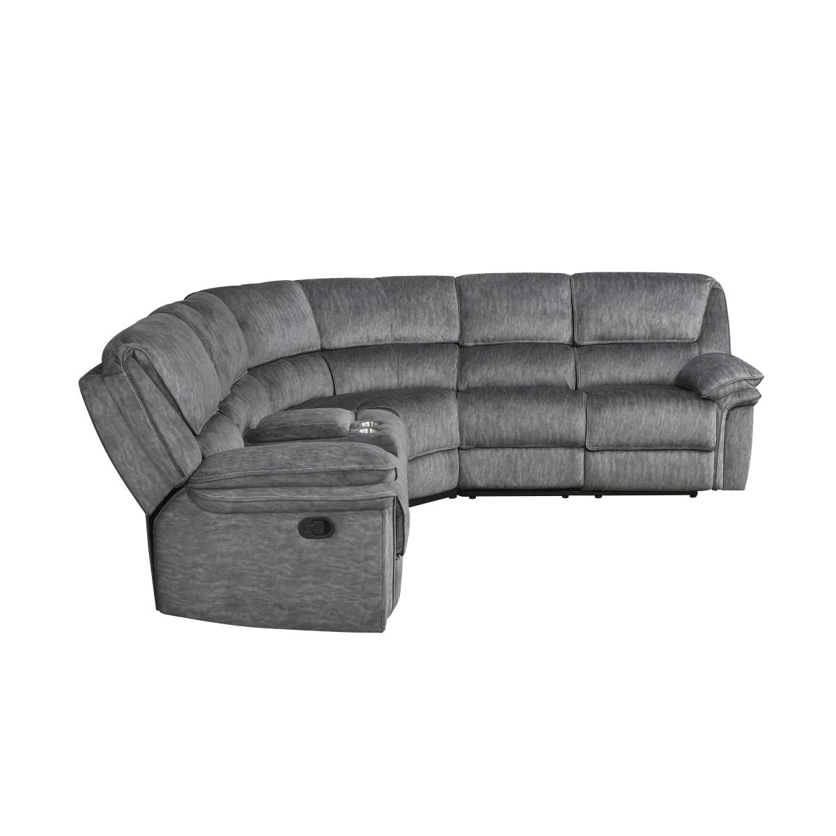With a versatile style that is perfect for your casual living room, the Muirfield Collections plush seating and modern aesthetic create a platform for your relaxation. The plush pillow-top arms and seating of the sectional is covered in smoke gray fabric upholstery for neutral accent to your homes decor. The left side seating of the sectional features a center console, its cupholders and hidden storage providing functional convenience to the group. The end chairs of the sectional feature manual-motion mechanisms that are operate with the pull of a side-mounted tab, taking you from seated to reclined in an easy motion.