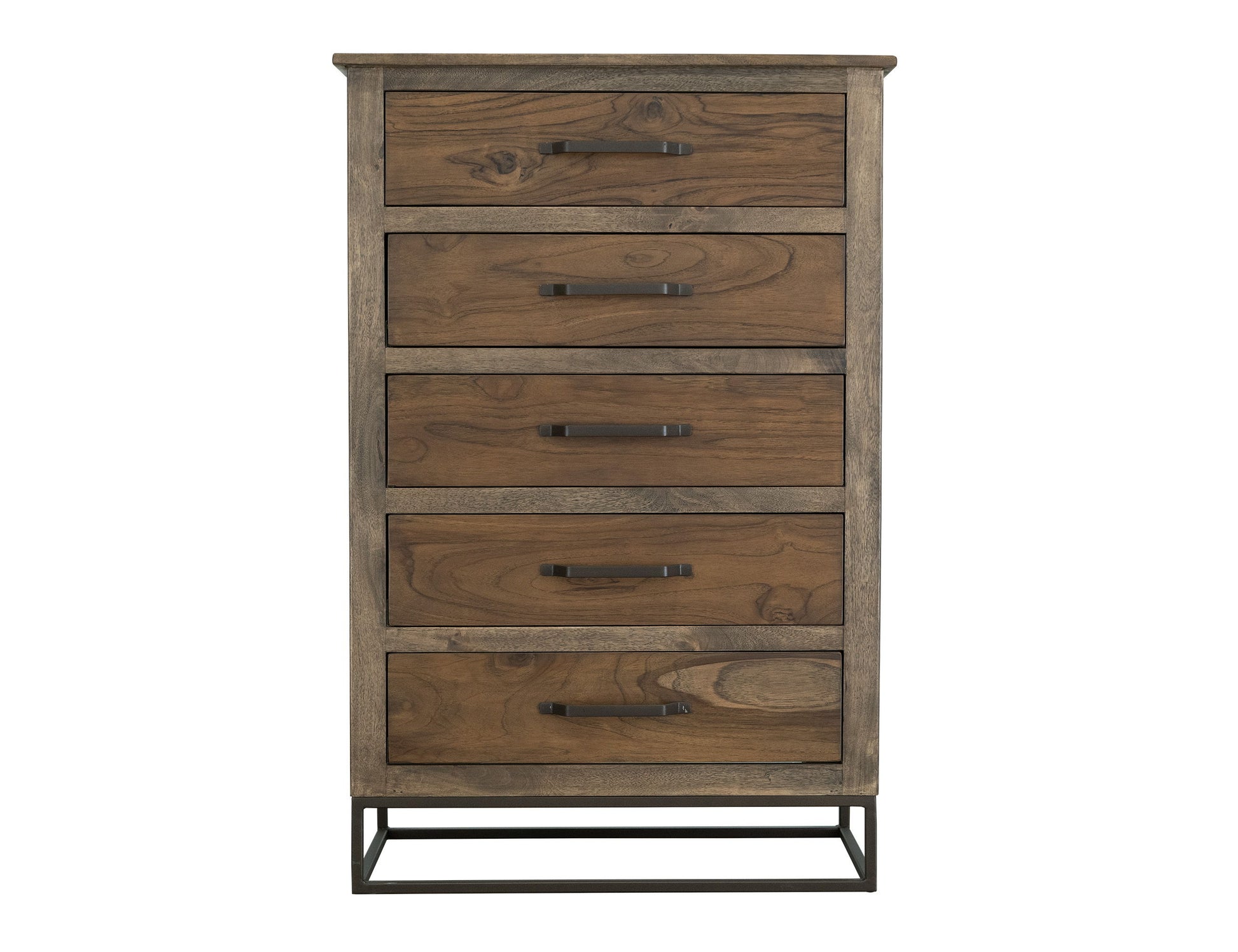 5 Drawer, Chest. The Teca collection captures the essence of transitional design by seamlessly blending metal and wood elements. It is meticulously crafted from sustainable mango wood and teak veneer with a translucent multi-step brown finish.