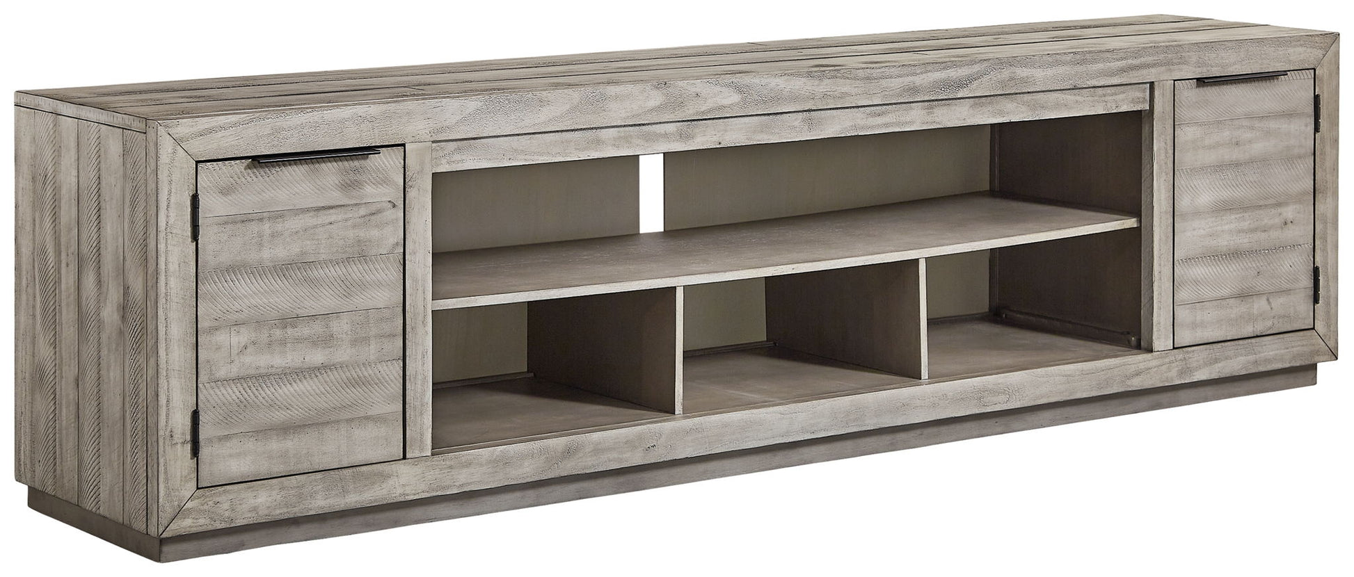 Balancing chic flair with a relaxed sensibility, this extra-large TV stand strikes just the right tone for rustic sophistication. Beautifully clean lines are subtly enhanced with relaxed distressing and saw marks for authentic barn wood character. You're sure to love the convenient open style for easy access to media equipment and accommodating pretty home accents.