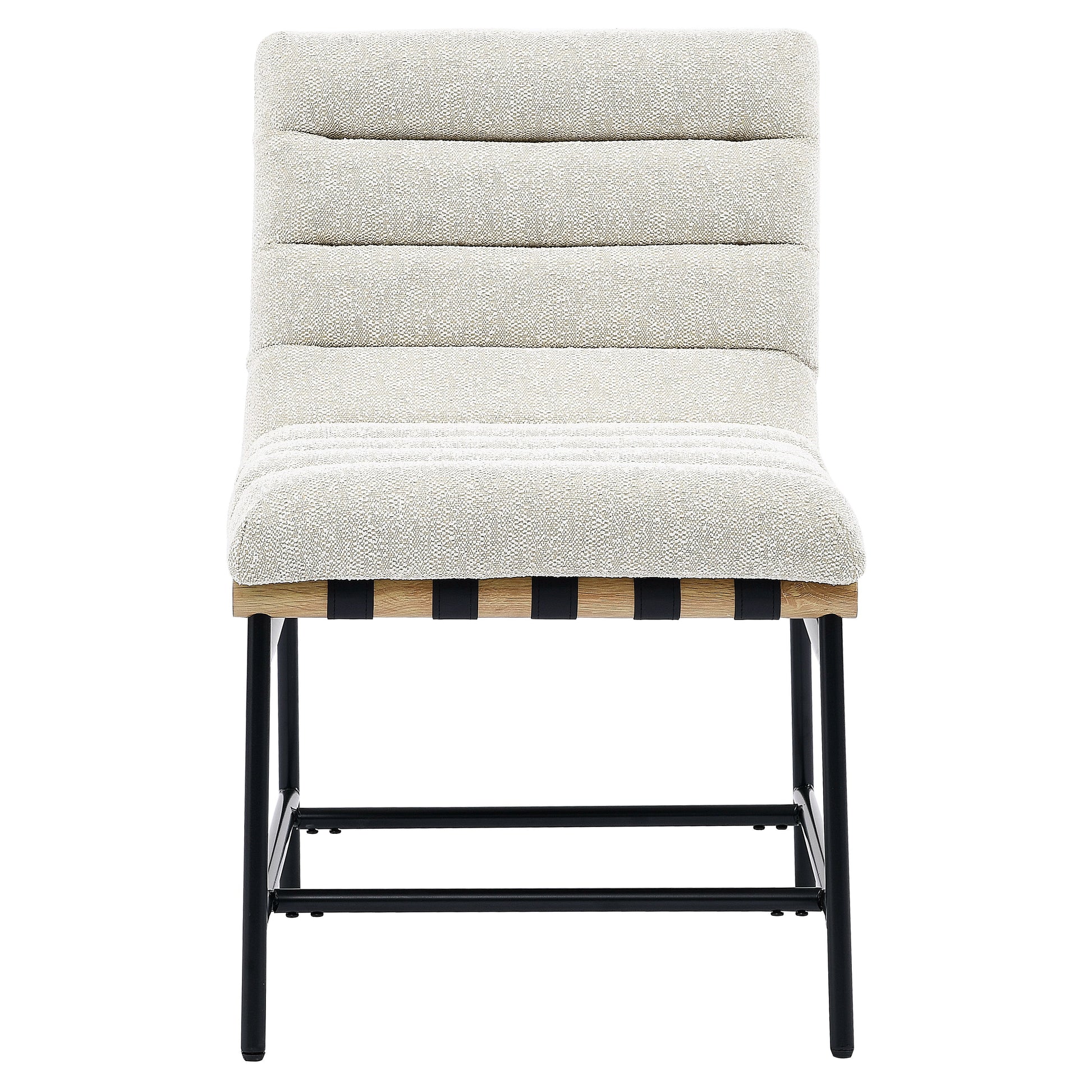 The Nicco Side Chair elevates any space with its perfect blend of modern design and comfort. Ideal for dining, accent, or office use, this chair features a cushioned seat and back with a sleek channel design, upholstered in easy-care in an color that complements any décor. The webbed seat suspension offers "floating" comfort, while the durable iron frame, reinforced with side and cross stretchers, ensures lasting stability. The Nicco Side Chair delivers style and function in one sleek package.