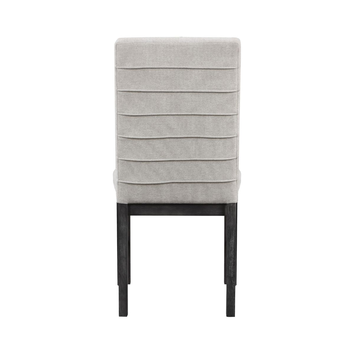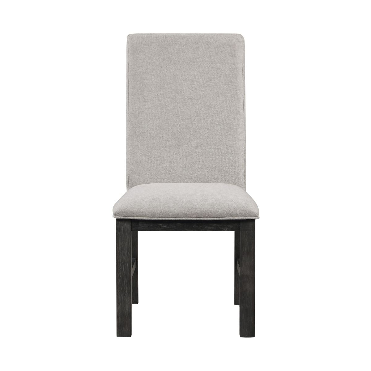 The transitional framing of the Orem Collection will provide a perfect mealtime platform for your casual dining room. The antique black finish of the collections oak veneer creates a versatile decorative accent to your space. Gray fabric upholstery covers the seats and backs of the wood leg-supported side chairs.