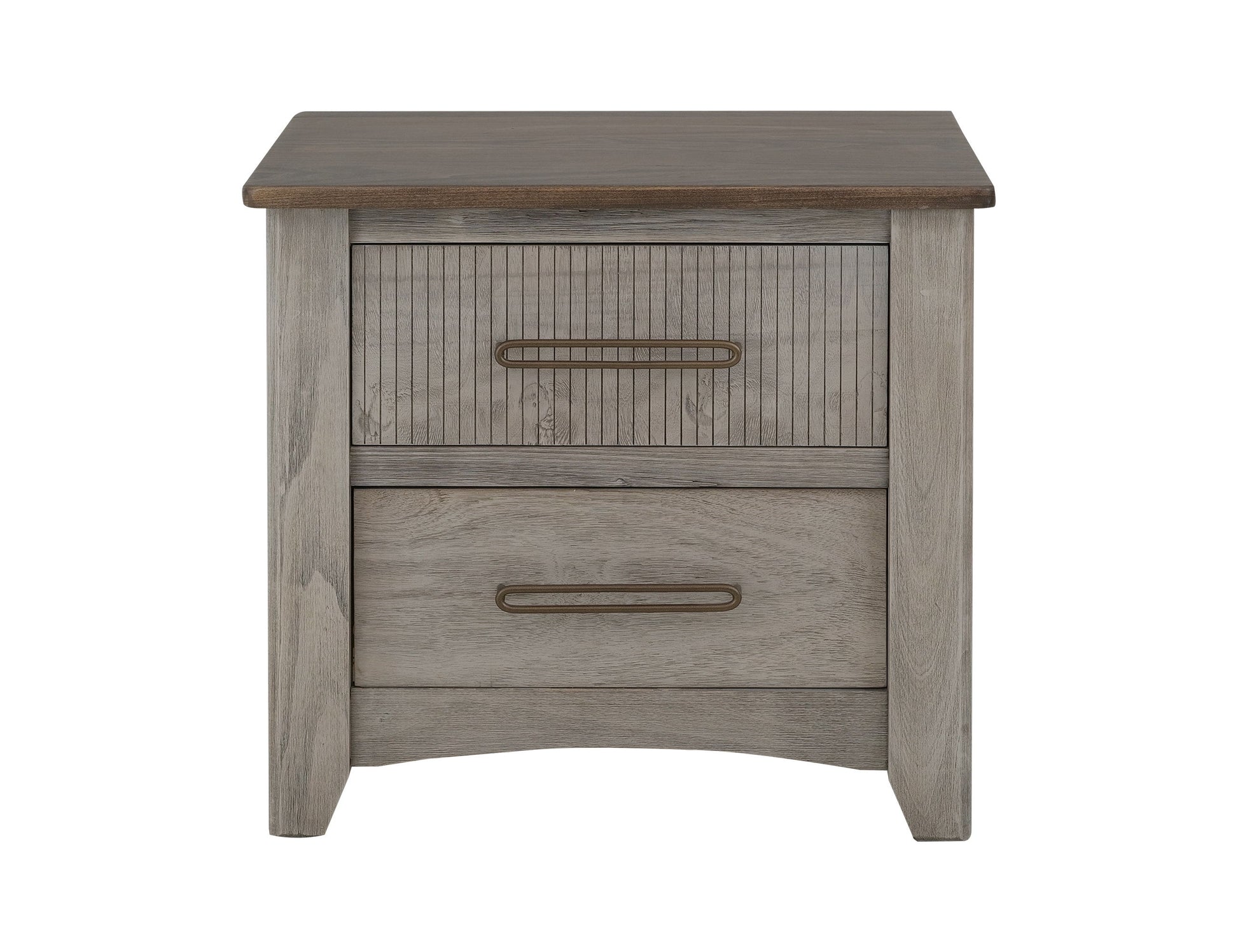 2 Drawer, Nightstand. The Ridge nightstand features two spacious drawers, offering plenty of storage for all your bedroom essentials. It features sleek metal handles that enhance its modern aesthetic. Made from Melina and poplar wood, this collection guarantees durability and timeless appeal. The elegant light gray finish and brown tops blend seamlessly with any décor style. Additionally, the channeled design adds a touch of sophistication and texture to the furniture.
