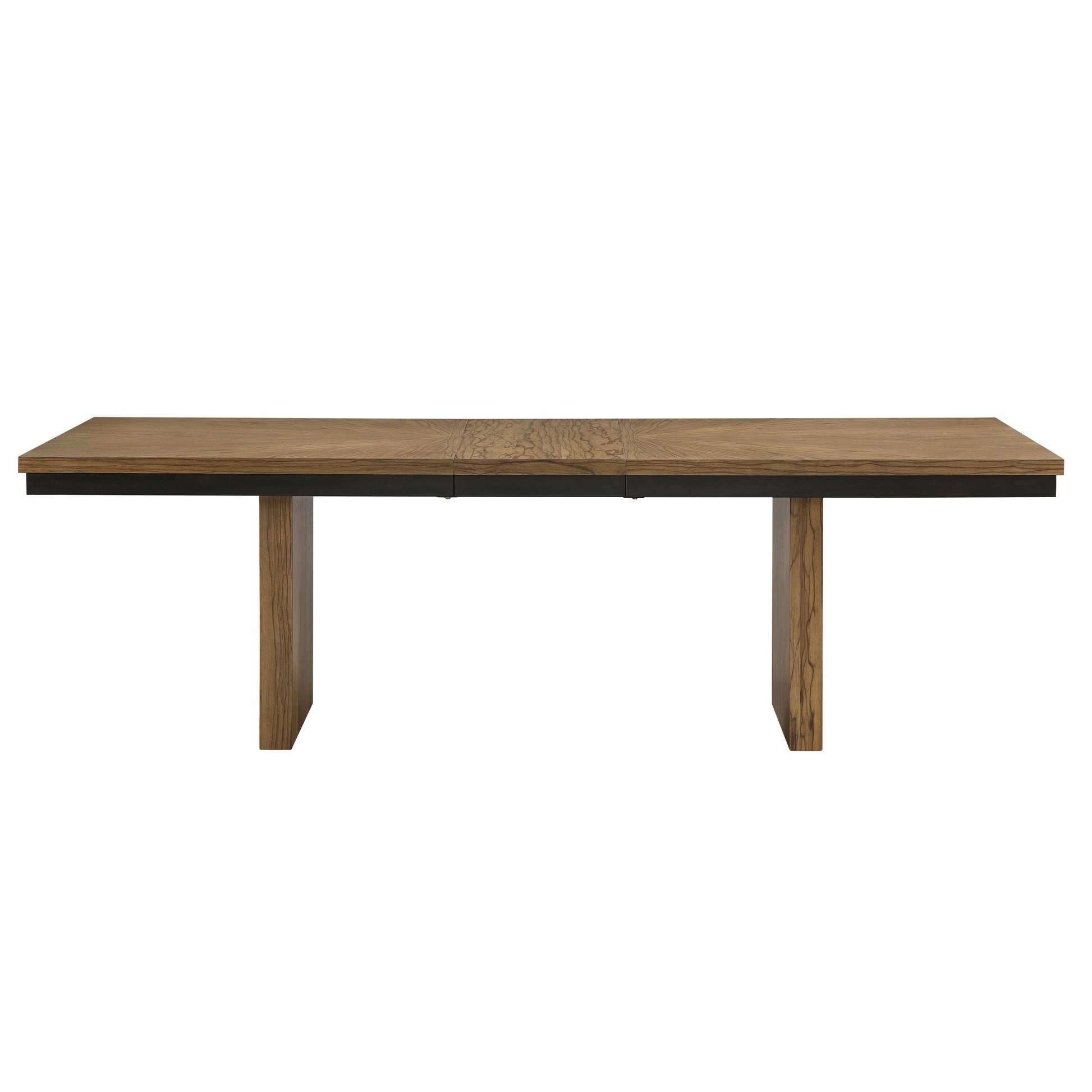 The Roatan 80-96 inch Table with a self-storing 16-inch leaf combines modern design with functionality, making it a standout piece for any dining area. This double pedestal table easily seats ten, offering a perfect solution for both intimate family dinners and large gatherings. Its sturdy base and stylish support enhance the room’s aesthetic while providing reliable durability. The light toffee finish and reverse-matched diamond veneer highlight the natural beauty of the wood, adding warmth and sophistication to your décor. Crafted from limba veneers, solid Asian hardwoods, and engineered woods, this table features a streamlined, elegant look with a two-tone toffee and black finish. The table extends effortlessly with a high-quality steel glide and stores the leaf conveniently underneath.