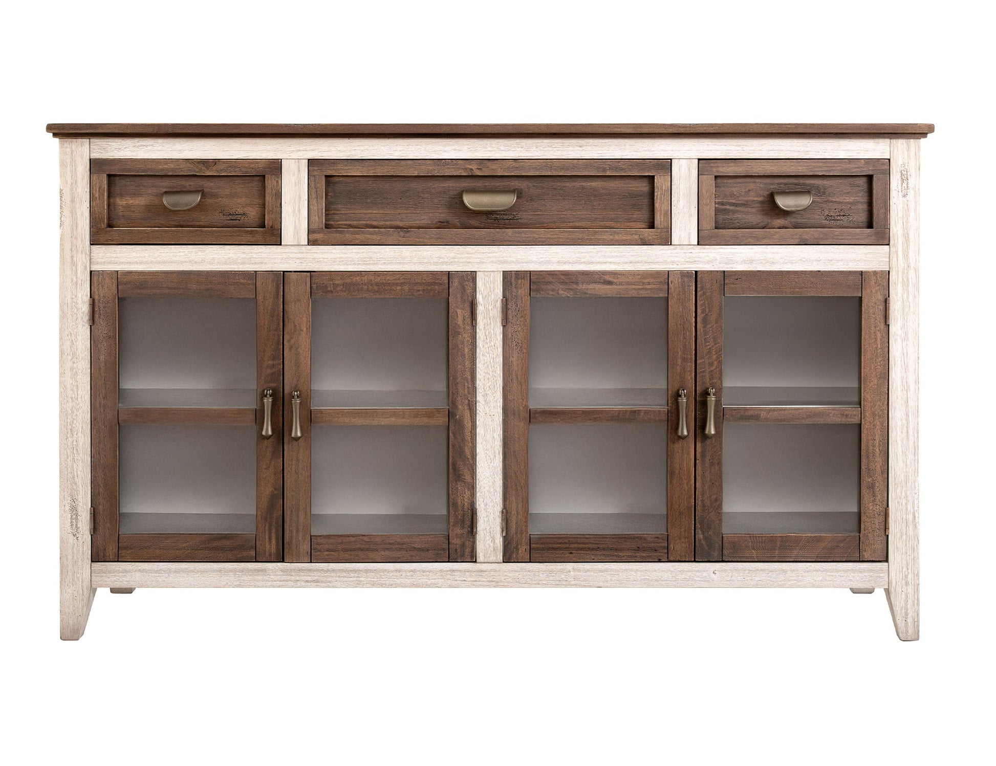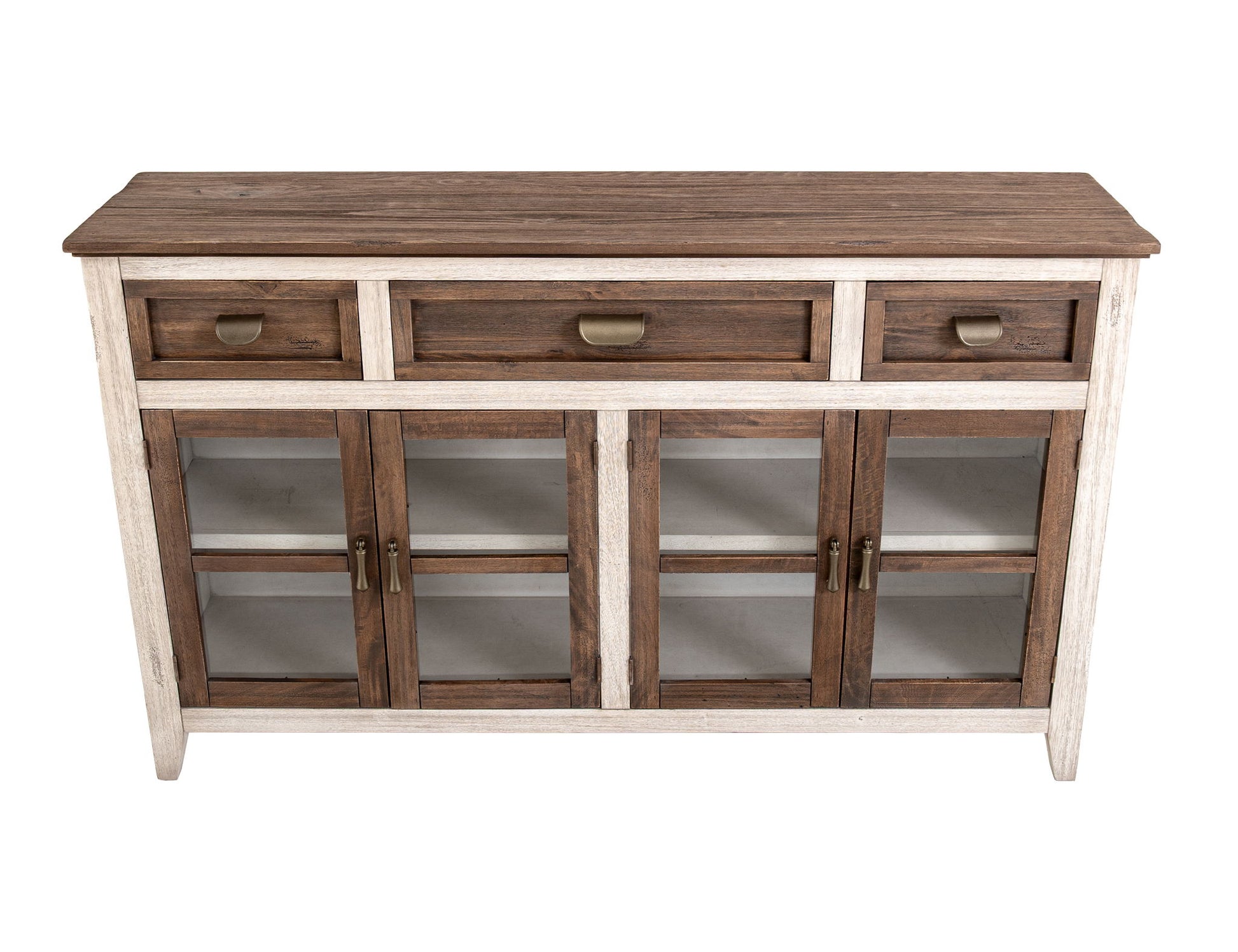 3 Drawer 4 Glass Door Console. Introducing Sahara, an organic modern collection designed to transform your space into a tranquil and neutral haven. Crafted from sustainably sourced, lightly distressed mango wood, this stunning minimalistic collection effortlessly blends style and sustainability, making it a perfect fit for any space.