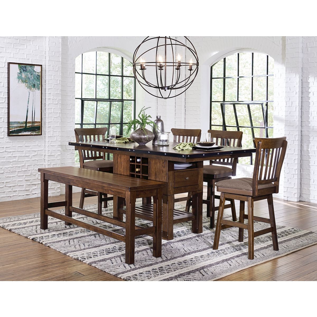 Transitionally styled with a burnished brown finish, the Schleiger Collection features bold accenting and functional storage options.The available counter height bench allows for versatile seating configurations.