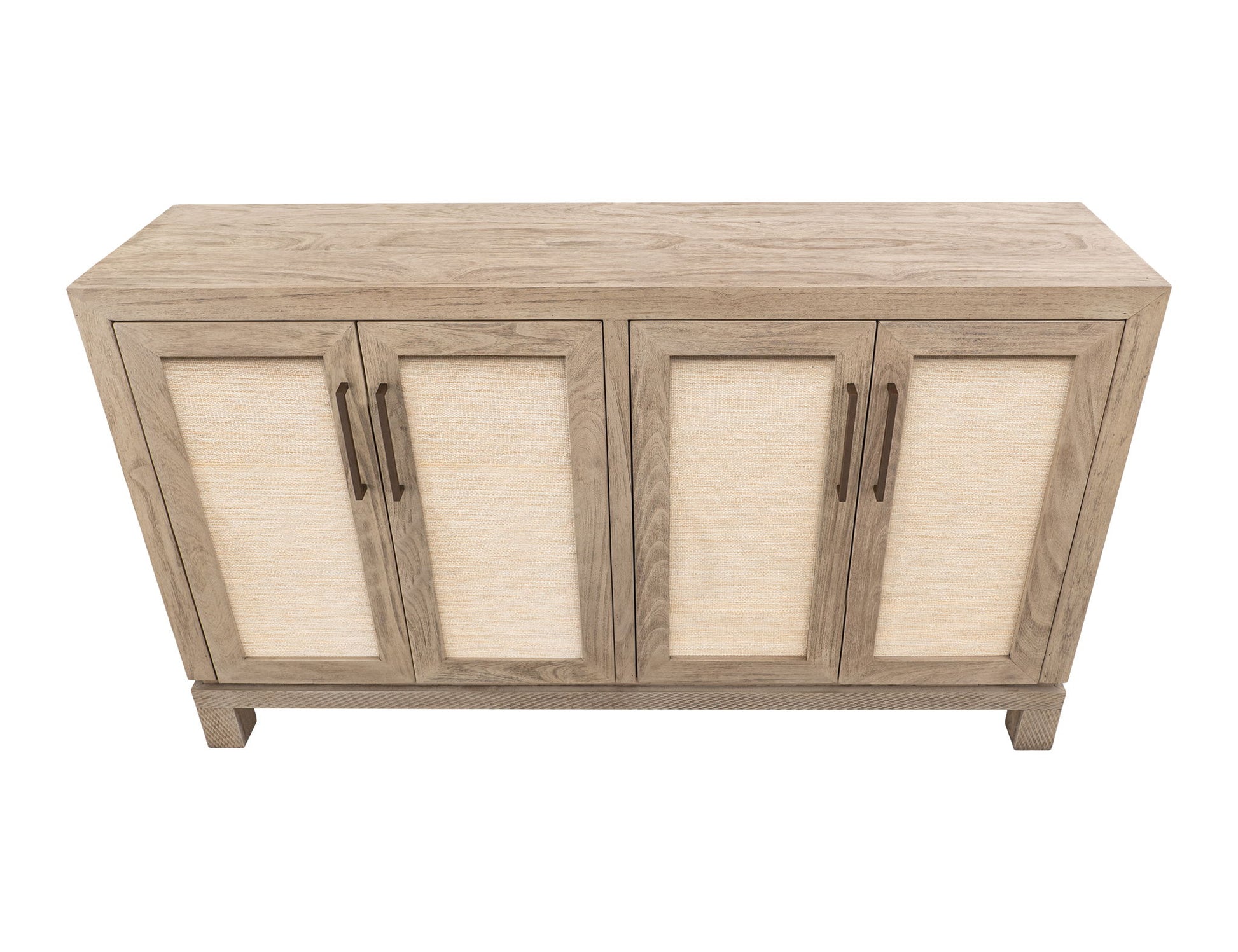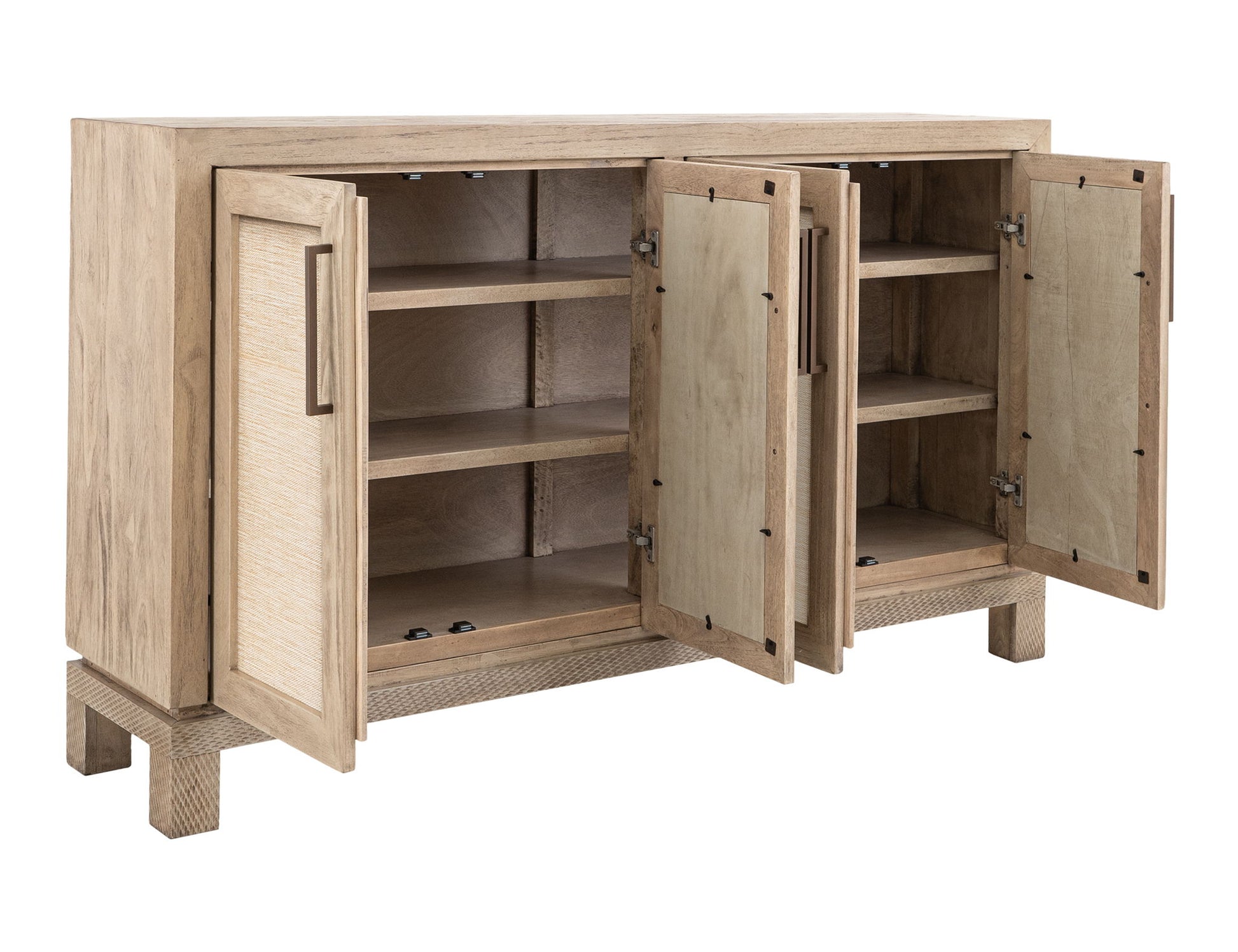 4 Door, Console. Bring warmth and character to your home with the Solara Console, expertly handcrafted from solid Melina wood and finished in a lacquer. The door panels are adorned with woven yucca fiber, and the base features CNC-machine textured, providing a touch of organic charm and elegance. It features two shelves for practical storage and custom metal pulls; the Solara seamlessly combines artistic details with functional design, crafted to be cherished for a lifetime.