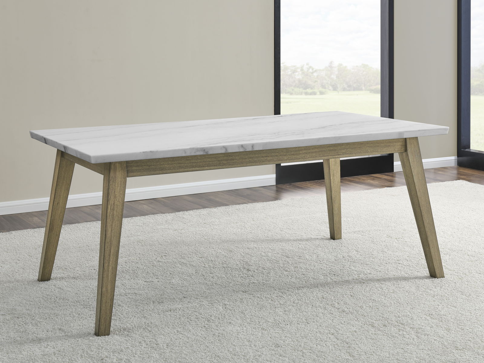 - Mid-century modern design with a Scandinavian accent, the 72-inch table features a beautiful marble top with knife edge atop canted solid wood legs in a beautiful expression of simple sophistication