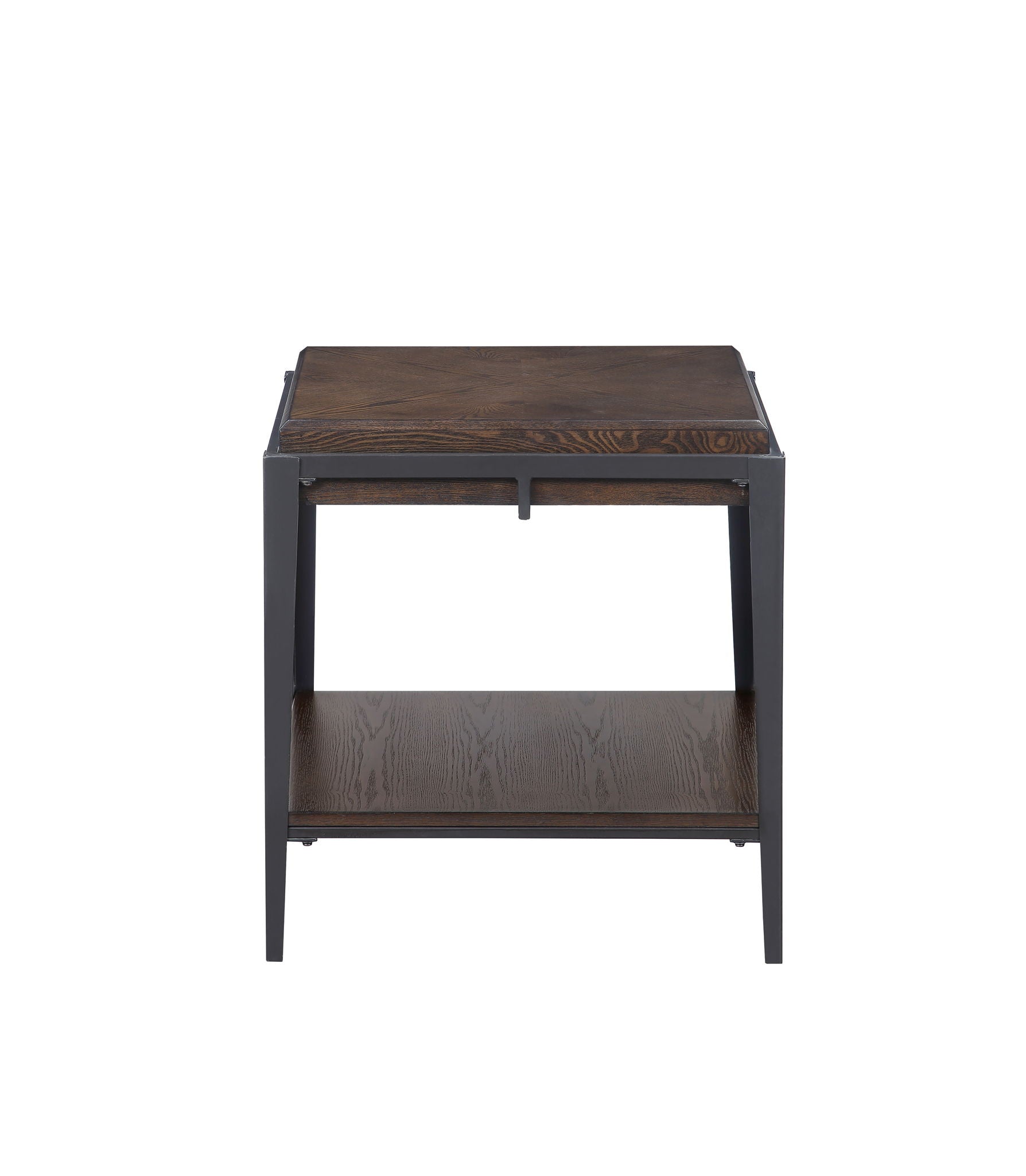 Elegant modern styling in an End Table that will dress up any room. An espresso finish highlights the ash veneers that combine with an iron frame in a mixed-media package that will steal the show in any room. A bottom shelf adds room for display or while the chamfered edge top softens the design and adds finesse to the contemporary table design.