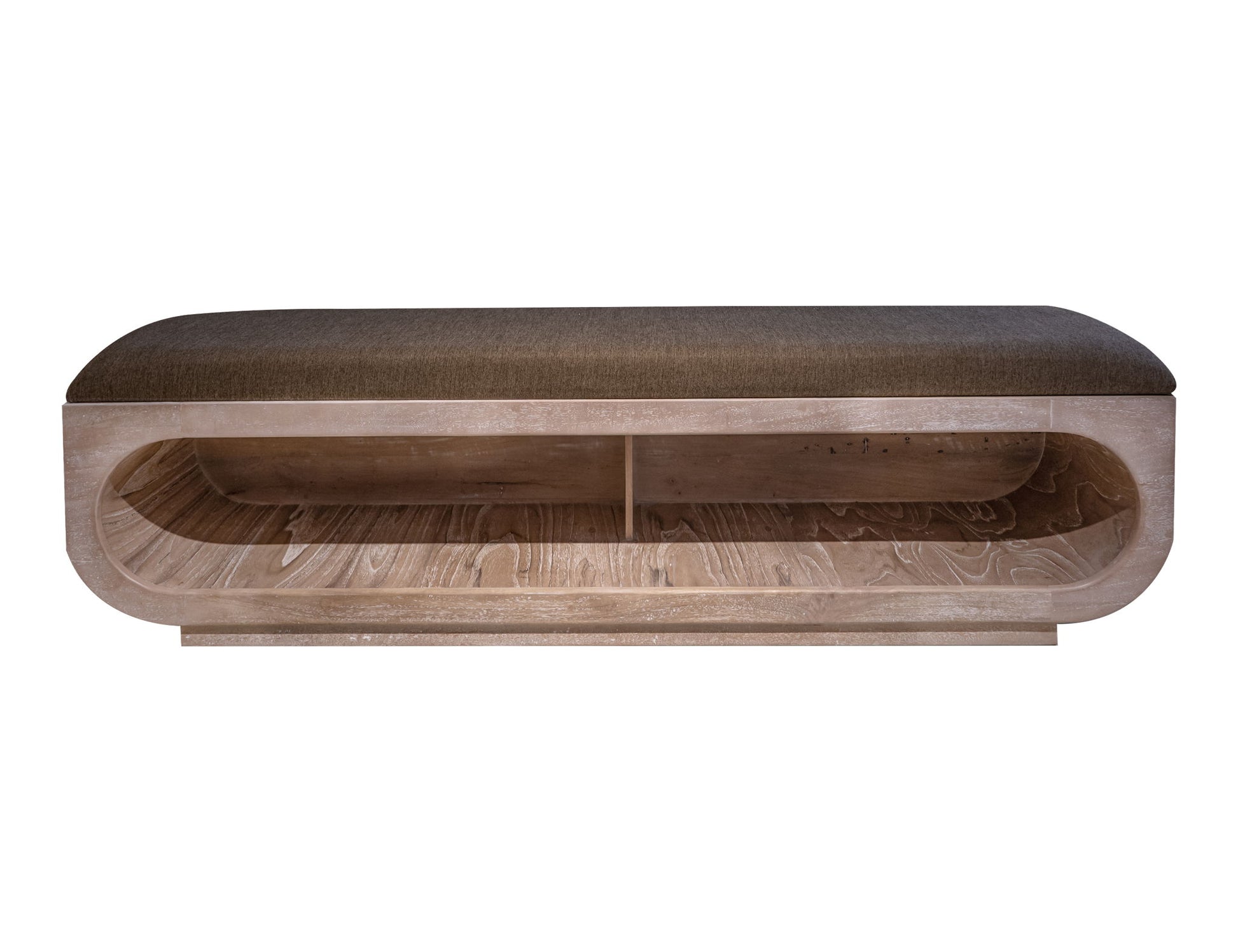 Wooden bench with a cushioned seat and open storage underneath.. The Balam bench is a beautifully crafted piece made from sustainable mango and engineered teak wood. Its elegant design blends organic warmth with modern sophistication, making it a perfect addition to any space. The bench features a comfortable brown cushioned seat with gently rounded corners and an open storage compartment for books, blankets, or decorative items. Ideal for an entryway, bedroom, or reading nook, the Balam bench adds effortless charm to any setting.