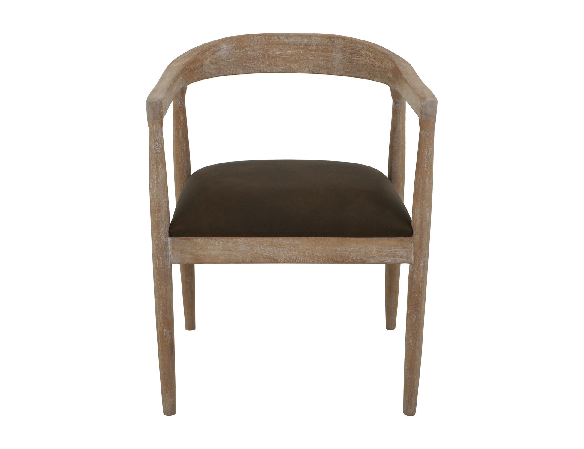Upholstered seat, wooden armchair. The White Teak chair, inspired by organic design principles, is carefully crafted from melina wood and finished by our artisans in ivory color. Its seat is upholstered in faux leather, adding sophistication and comfort to your dining experience.