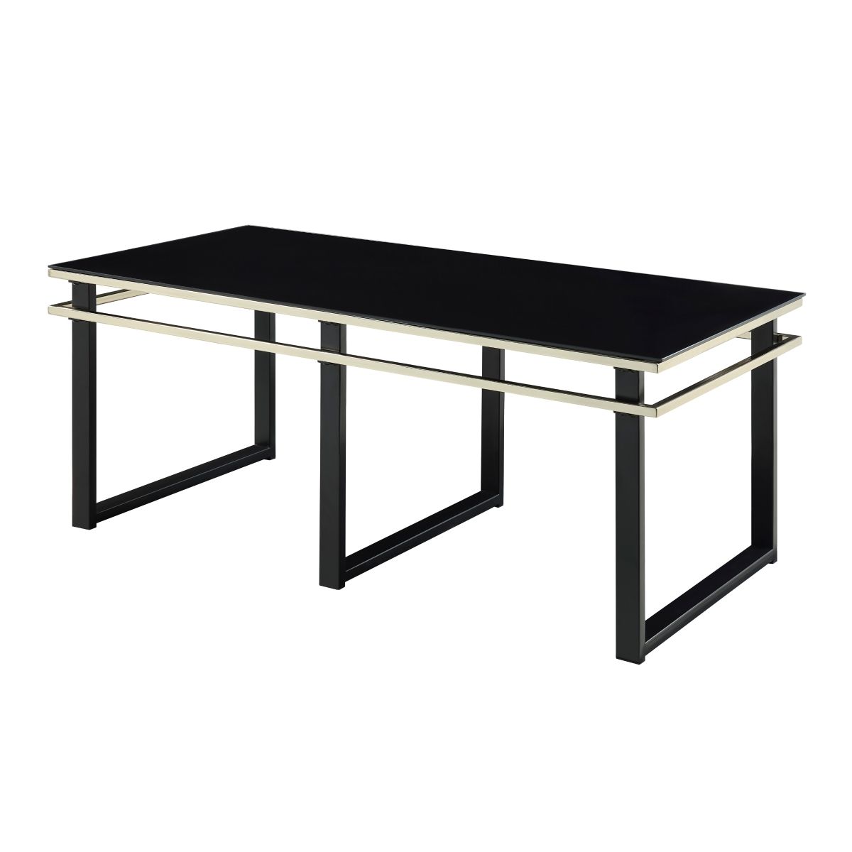 The convenient pairing of the Zamir Collections cocktail and two end tables provides an easy addition to your homes living room. The elegant contrast of the black tempered glass tabletops, gold-hued banding, and metal legs creates a modern look for your homes living room. The rectangular shape of the cocktail tables top and the square top of the two end tables presents a classic profile, and ample tabletop display space.